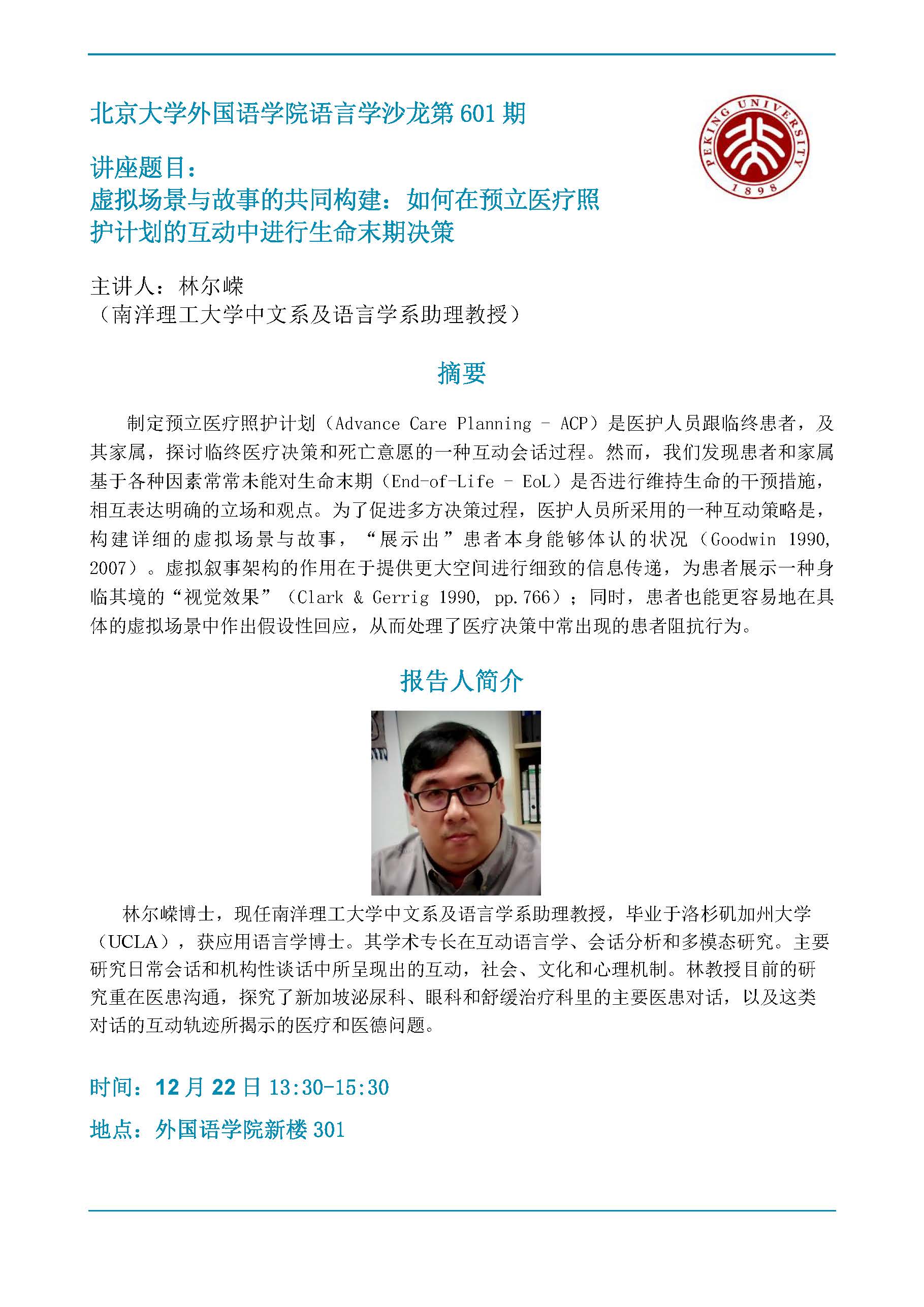 B体育平台语言学沙龙第601期:虚拟场景与故事的共同构建:如何在预立医疗照护计划的互动中进行生命末期决策