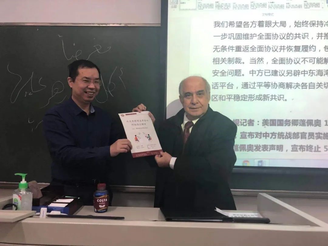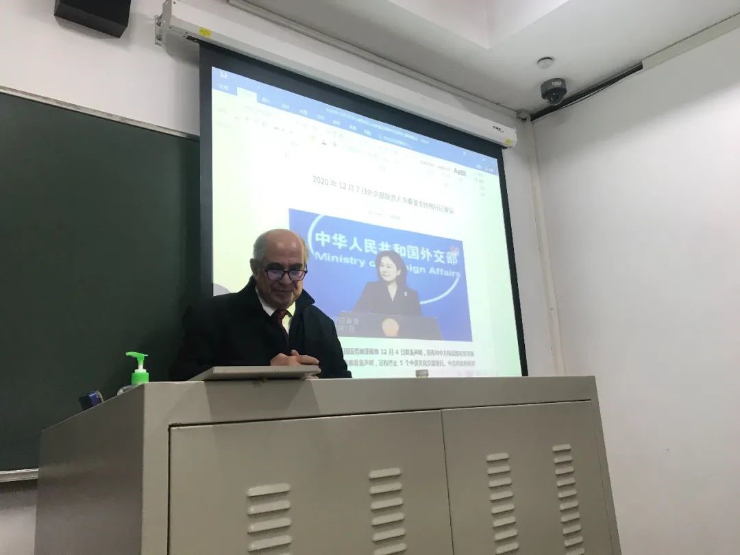 2020年12月9日上午,B体育平台阿拉伯语系课程集群思政进课堂系列讲座邀请了阿拉伯信息中心主任、曾任教于北京大学阿拉伯语系的前巴勒斯坦驻华大使穆斯塔法•萨法里尼先生来到教室为同学们讲课。本次讲座由阿拉伯语系袁琳老师主持,林丰民教授评议。