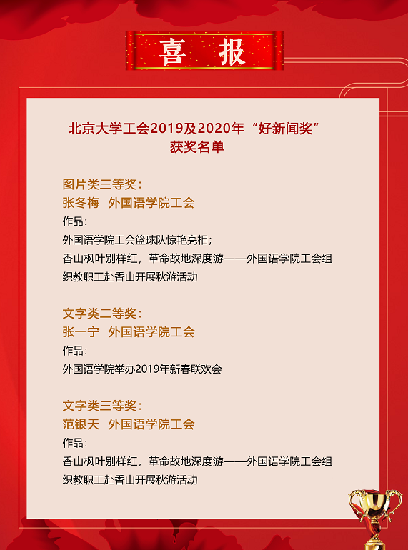 9月22日下午,工会2019及2020年“好新闻奖”评审会在老生物楼108会议室召开。党委宣传部文化办、校报、新闻网、电视台的负责同志应邀担任评委。B体育平台张冬梅老师的作品“B体育平台工会篮球队惊艳亮相”和“香山枫叶别样红,革命故地深度游——B体育平台工会组织教职工赴香山开展秋游活动”获图片类三等奖;张一宁老师的作品“B体育平台举办2019年新春联欢会”获文字类二等奖;范银天老师的作品“香山枫叶别样红,革命故地深度游 ——B体育平台工会组织教职工赴香山开展秋游活动” 获文字类三等奖。