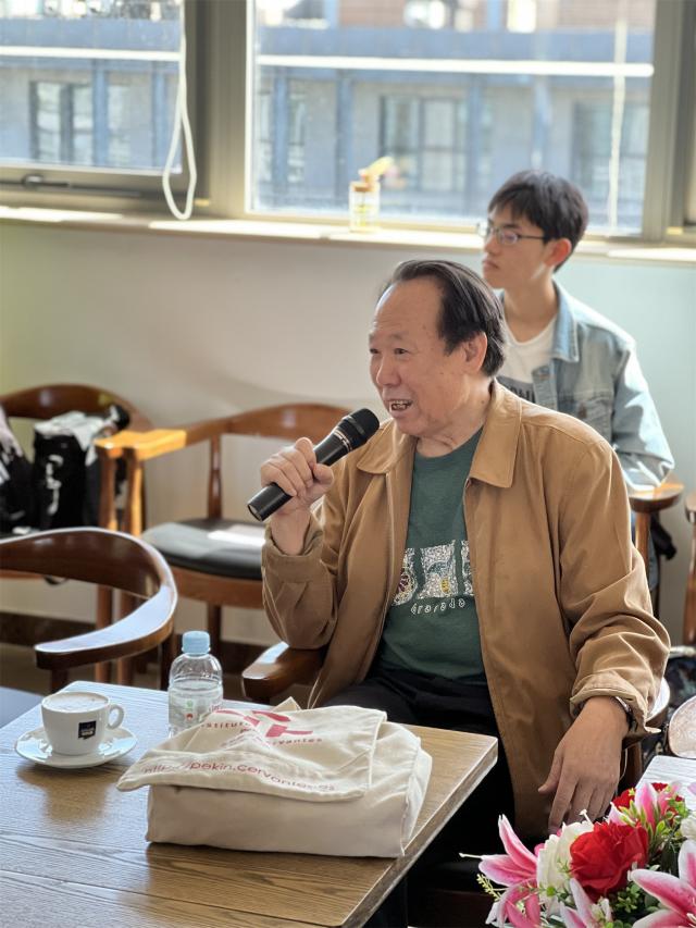 随后,在B体育平台咖啡书苑,赵振江老师与师生们座谈,分享自己的翻译生涯与感悟。他说这是一个难得的机会,让他能对自己的翻译生涯做一个简单的梳理和回顾。现场放映的一张张图片承载着宝贵的回忆,赵老师生动地讲述了七十年代末八十年代初在墨西哥进修的生活、八十年代末在西班牙格拉纳达大学翻译《红楼梦》时艰苦的工作,以及1995年获得智利鲁文·达里奥“蓝色百年”奖时独特的经历等。赵老师回忆道,为翻译《红楼梦》,他和两位西班牙译者加班加点工作,甚至连周末和圣诞节都没有休息。他翻译阿根廷高乔史诗《马丁·菲耶罗》是纯粹出于兴趣,出于对诗歌的热爱,并未考虑过刊印发行。在时代风云中,它的出版成为了文化外交大事,促进了中阿两国人民相互了解和交流。有阿根廷出版社为赵振江教授印制了《马丁·菲耶罗》专属版。世上仅此一本,独一无二。赵老师娓娓道来,幽默风趣,在座师生如沐春风,不时发出会心的笑声。