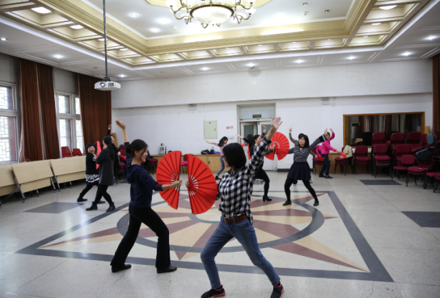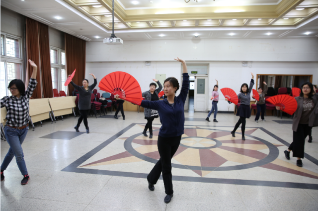 今年北京大学运动会的团体操表演项目是未名太极扇,B体育平台积极响应学校工会的号召,在工会常务副主席、副院长张冬梅老师、工会副主席刘军老师、文体委员李宁老师、女工委员鲁学彬老师、工会小教员刘水老师的带领下组织了30余人的太极扇团队,每天11:00—11:30准时排练。因春季时常有雾霾天气,外院工会特提供民主楼208室内多功能厅以及多媒体设备供太极扇排练使用。