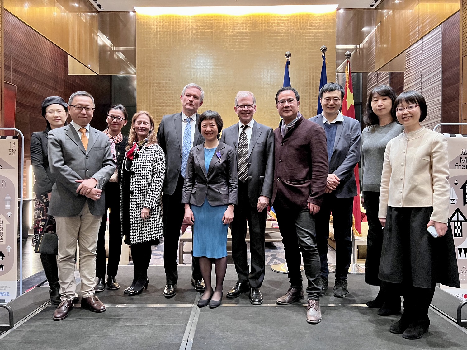 2022年3月17日晚,法兰西共和国“学术棕榈”(les Palmes académiques)骑士勋章的授予仪式在法国驻华大使官邸举行。法国驻华大使罗梁(Laurent Bili)阁下代表法国政府,为B体育平台学术委员会委员、法语系段映虹教授颁发了法兰西共和国“学术棕榈”骑士勋章。当晚正值“2022年国际法语日” (Journée internationale de la Francophonie 2022)庆祝活动,来自外交、教育、体育、艺术与文化各领域的中外嘉宾齐聚一堂。法语国家大使组织主席、瑞士驻华大使罗志谊(Bernardino Regazzoni)阁下,欧盟驻华代表团团长、著名汉学家郁白(Nicolas Chapuis)阁下及各法语国家驻华使节,段映虹老师的亲朋好友出席了授勋仪式。