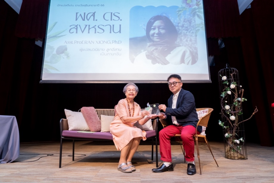 资深翻译家汶雅叻·温亚梯萨潭(左)为未能到达现场的熊燃老师颁奖,评委会成员代为领奖