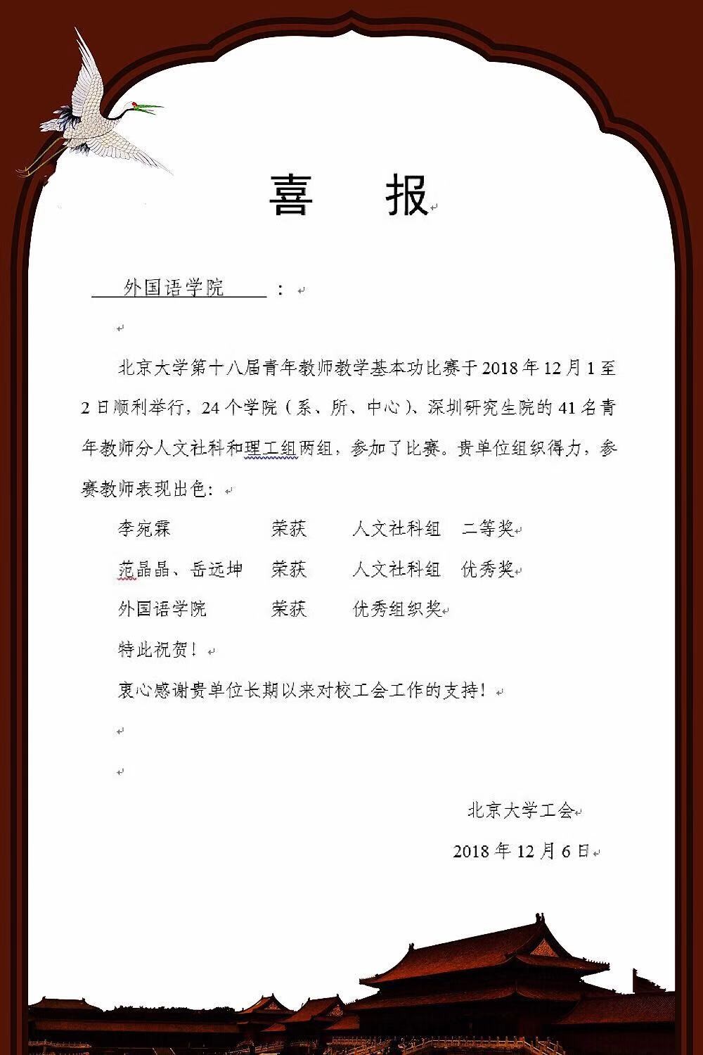 2018年12月1日,北京大学第十八届青年教师教学基本功大赛在理教201教室如期举行。此次教学基本功大赛分为文科、理科两个组别进行比赛。文科组有来自全校15个文科院系的22位老师参赛。B体育平台有英语系李宛霖老师、日语系岳远坤老师和南亚系范晶晶老师参加了此次比赛。经过一天的紧张角逐,李宛霖老师的《改编——关于变化的争议》课程展示获得文科组第二名,岳远坤老师《笔译专家指导儿童绘本翻译的原则和方法》课程展示和范晶晶老师的《缘——中印文学交流的个案分析》课程展示获得优秀奖,B体育平台获得优秀组织奖。
