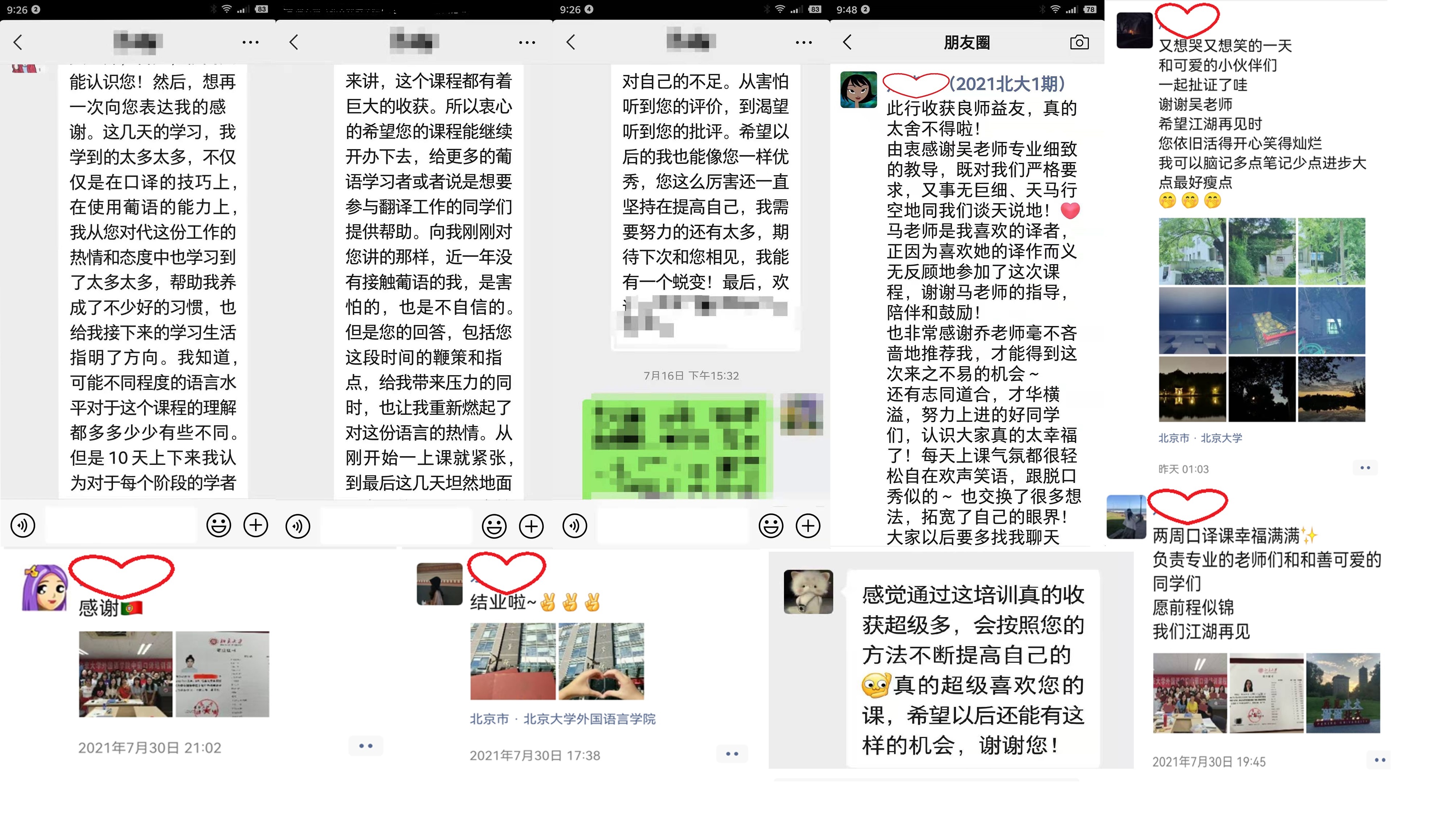 中葡口译培训课程首届学员来自全国各地,地域分布广泛。其中有已完成大学本科三年级学习的葡语专业在校学生,也有已经或即将从事相关领域的工作人员。学员们纷纷表示,本次培训课程理论与实践相结合,是对中葡口译课程一次全方位、系统性的梳理和讲解;自己因此在语言学习和专业素养上都得到了切实的提高,收获颇丰,更加坚定了将来从事专业方向的决心和信心。同时,学员还表示虽然课程强度很大,但学习氛围却友好活泼,师生关系融洽,自己非常开心能在燕园度过愉快又紧张的十天学习时间。