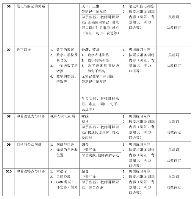 本课程为中葡交替传译的面授实践课程,通过选用时政、外交(中国-澳门-葡语国家关系、金砖国家)、卫生、能源、环保、教育等领域的训练素材,循序渐进地介绍听力理解、信息记忆、分析和输出等交替传译的技巧,现场操练,活学活用。通过丰富实用、实操性强的案例,契合实战的训练方法,有针对性的问题解决方案和难点应对建议,帮助学员在最短时间内快速提高口译水平,具备担任陪同翻译或普通交替传译工作的能力。