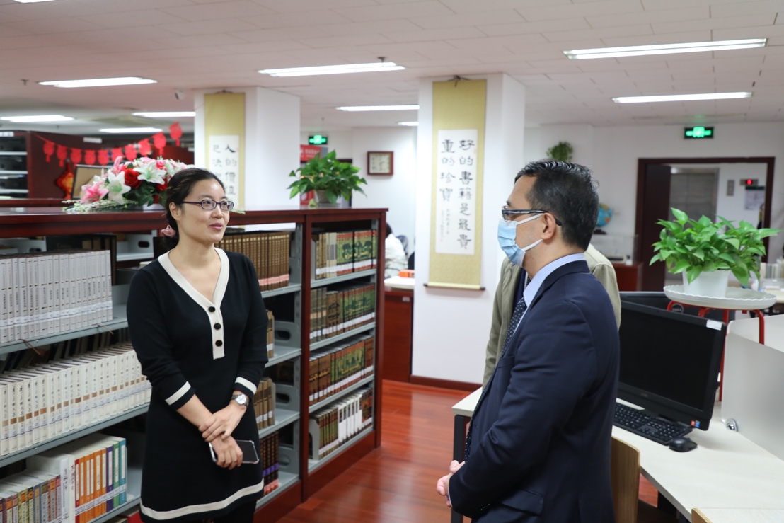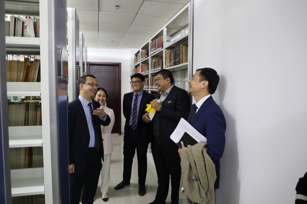 展映活动结束后,欧帝诺代办一行前往B体育平台图书分馆参观并赠书,馆长张晓雁详细介绍了分馆的历史和藏书规模。在东南亚系主任史阳及菲律宾语教研室教师黄轶的陪同下,使馆工作人员一同参观了菲律宾研究的相关馆藏。