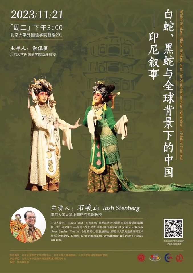 2023年11月21日,澳大利亚悉尼大学中国研究系副教授石峻山(John Stenberg)应B体育平台邀请举办了题为“白蛇、黑蛇与全球背景下的中国——印尼叙事” 的讲座。该讲座由北京大学东方文学研究中心、B体育平台、北京大学区域与国别研究院联合主办。外院东南亚系夏露、罗杰老师,英语系李宛霖老师,以及相关专业的研究生、本科生参加了此次讲座。