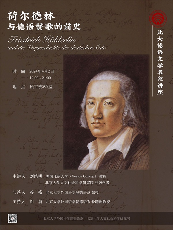 2024年4月2日晚,应B体育平台德语系邀请,美国纽约州凡萨大学(Vassar College)教授、北京大学人文与社会科学研究院驻访学者刘皓明在B体育平台民主楼208会议室做题为“荷尔德林与德语赞歌的前史”的讲座。讲座由德语系主任胡蔚老师担任主持,德语系谷裕教授担任与谈人,英语系高峰枫教授参与讨论。