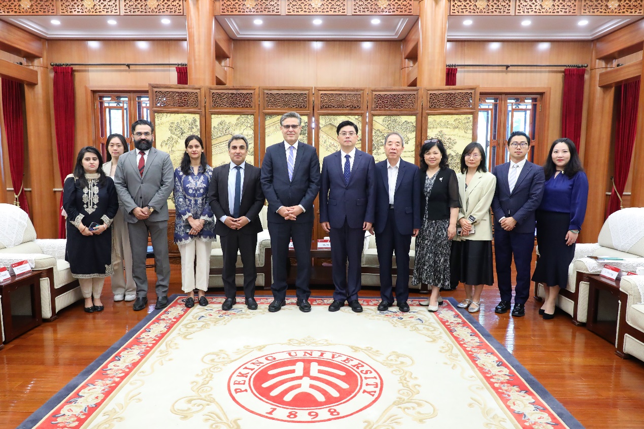 6月22日上午研讨会开幕前,北京大学党委常委、副校长方方在临湖轩会见了前来参会的巴基斯坦驻华大使卡里尔·哈什米一行。
