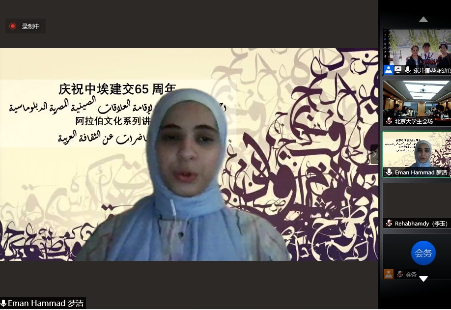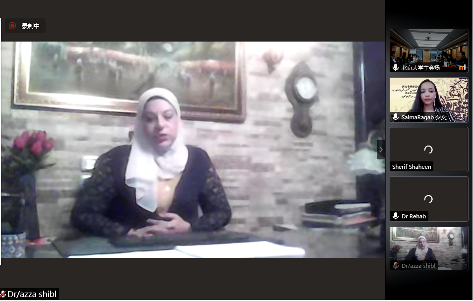 为庆祝中埃建交65周年,继成功举办北京大学与开罗大学“中国文化春令营”活动之后,两校又进行了新一轮的合作,于5月7日至8日联合举办“阿拉伯文化春令营”系列讲座。本次系列讲座线上线下协同进行。出席开幕式的有开罗大学文学院院长谢里夫•沙欣(Sherief Shahin)、文学院中文系主任兼孔子学院院长李哈布(Rehab),文学院阿拉伯语系教授阿扎•席波乐(Azza Shebl),中文系教师李玉(Rehab)、梦洁(Eman)、夕文(Salma),B体育平台副院长付志明、阿拉伯语系主任林丰民、叙利亚籍专家哈穆德•优尼斯(Hamoud Younes)、叙利亚籍专家赛米拉•萨拉玛(Samira Salami)、阿拉伯语系长聘副教授廉超群、讲师袁琳、助理教授李海鹏、埃及籍博士后高山(Alaa Mamdouh Akef)及阿拉伯语系40余名学生。