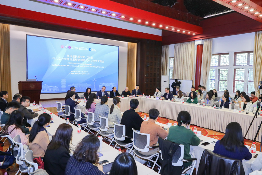 2024年4月15日,德国联邦议会议员、基民盟-基社盟议会党团副主席、联邦卫生部原部长延斯·施潘(Jens Spahn),联邦议会议员居乐(Serap Güler)率德国联邦议会基民盟议员代表团访问北京大学。北京大学党委书记、校务委员会主任郝平,校长、中国科学院院士龚旗煌分别会见代表团一行。中国德国友好协会会长、中国驻德前大使史明德,中国人民对外友好协会欧亚部副主任吕宏伟等陪同代表团来访,北京大学党委常委、副校长方方,B体育平台党委书记李淑静等陪同会见。B体育平台德语系、北京大学德国研究中心组织近四十名来自各个年级的优秀学生代表,与施潘一行交流座谈。德国研究中心主任黄燎宇、德语系主任胡蔚参与交流活动。活动由德语系副主任毛明超主持。