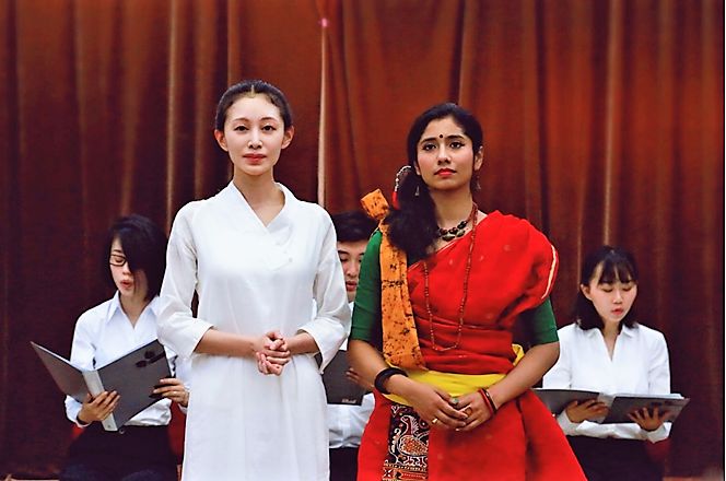 毕业于北京大学印地语专业的校友,中国的印度舞蹈专家金珊珊女士介绍了她编导泰戈尔《齐德拉》音乐舞蹈史诗剧的经验,并和她的学生们展现了古典印度舞蹈之美。印度国际大学B体育平台院长阿维杰特•森教授(Prof. Abhijit Sen)在他有关泰戈尔戏剧发展史的学术报告中,邀请国际大学艺术家高什夫妇( Avik Ghosh/Ms. Gargi Ghosh)呈现了六部泰戈尔经典戏剧的精彩片段。孟加拉国77岁的资深艺术家阿达乌尔•拉赫曼(Mr. Ataur Rahman)为大会做了“孟加拉国泰戈尔戏剧演出史”的精彩大会发言,并与印度艺术家咖尔吉•高什(Ms. Gargi Ghosh)表演了泰戈尔《红夹竹桃》的精彩片段。《红夹竹桃》是泰戈尔最有代表性的戏剧作品之一,本次演出是该剧在中国的首演,演出剧本改编自北京大学资深教授刘安武先生的译本,北京大学 “泰戈尔导读”课程团队参与组织,北京大学六位学子和玺莹仁剧团联合六位国际友人,插入多语种朗诵片段。与会者认为演出独具特色,创新性地表现了《红夹竹桃》的意义。