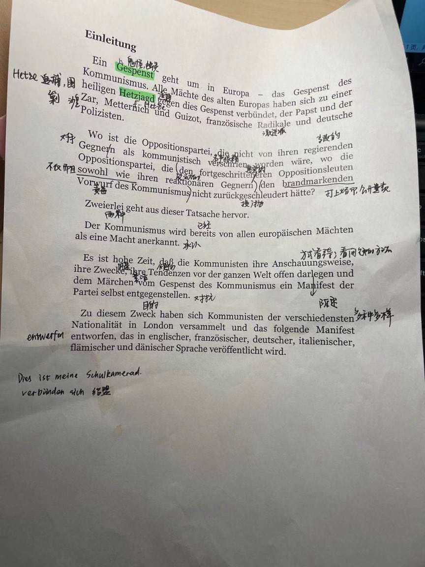 在活动开始前,团支书孙雨筠提前整理了《共产党宣言》德文版引言(Einleitung)和其中文翻译,供同学们阅读。首先,她带领大家梳理了引言当中的生词和句子结构。同学们在不看译文的情况下尝试着自己去理解这篇近200年前的杰作,虽然翻译没有专业的译本那么熟练,但在主谓宾分析中,同学们对于原版《共产党宣言》的用词和语言特征有了初步掌握。