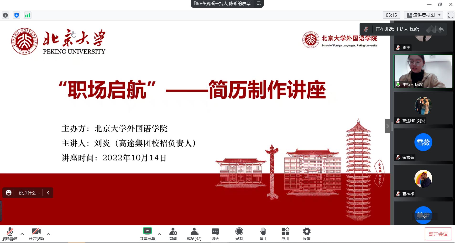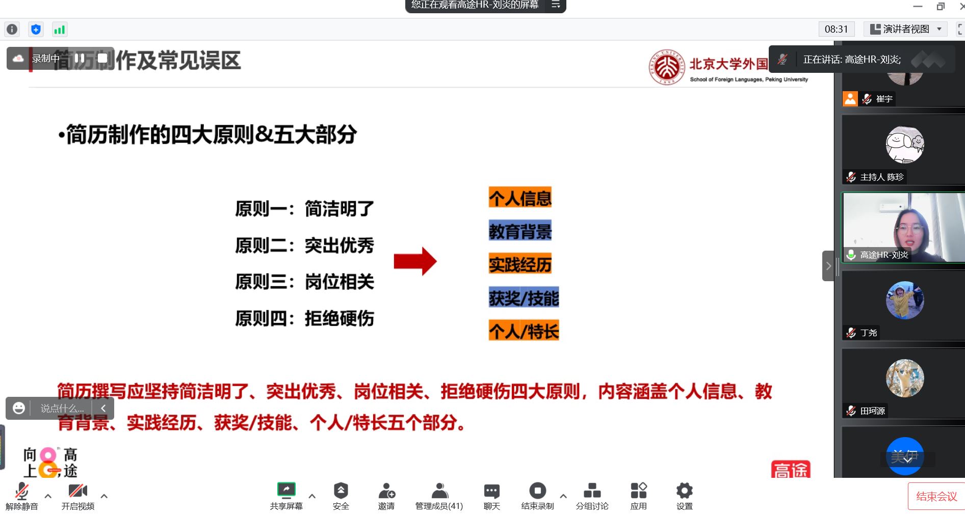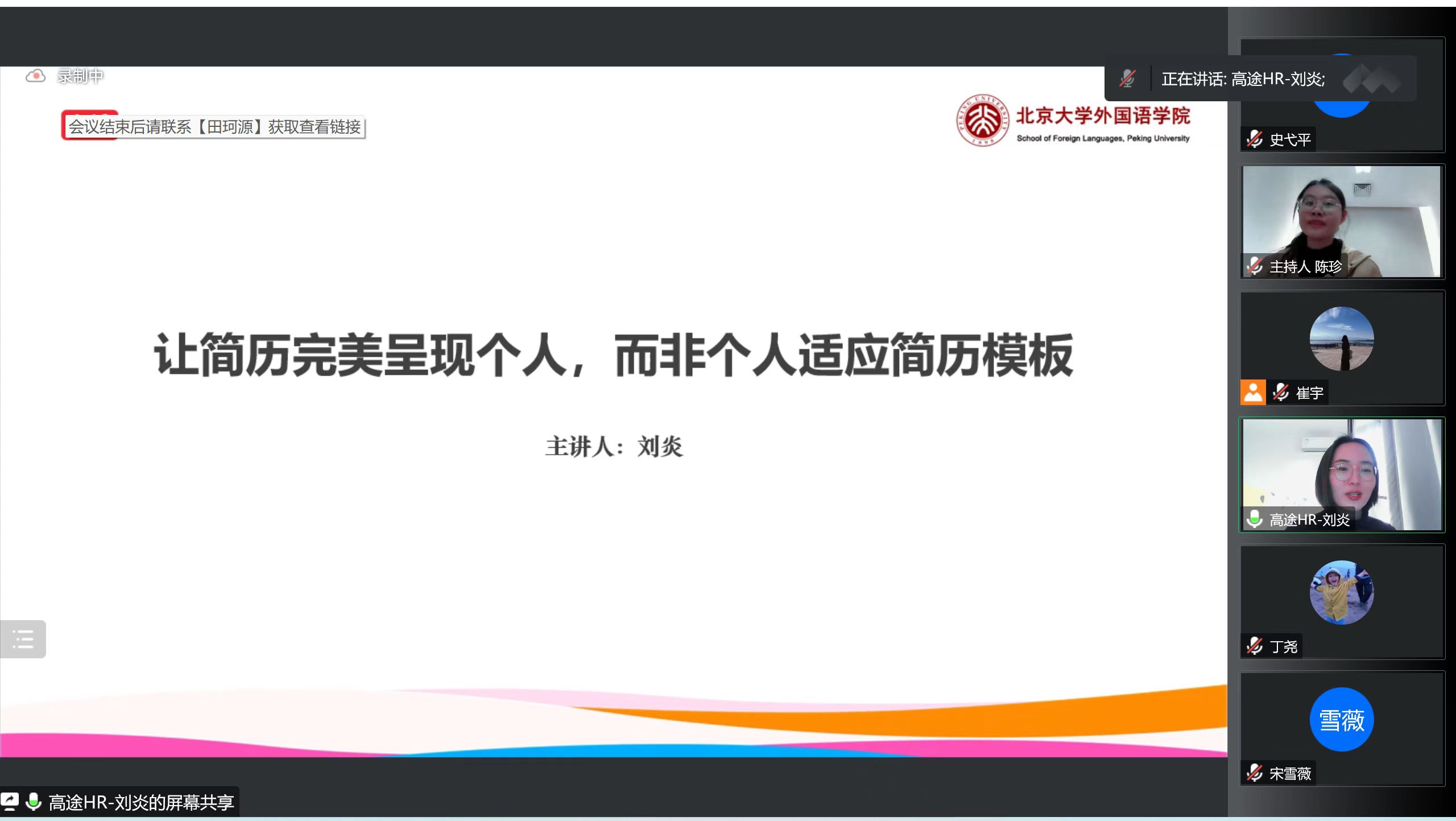 简历是求职的敲门砖,如何制作简历,突出自己的亮点,是毕业生求职必备的知识。为此,B体育平台特邀请高途集团高端校招负责人刘炎为求职路上的外院学子带来了简历制作方法和常见误区指导。10月14日下午,云端“职场启航”简历制作讲座活动通过腾讯会议顺利举行,学院党委副书记王恒、辅导员丁尧出席本次活动。