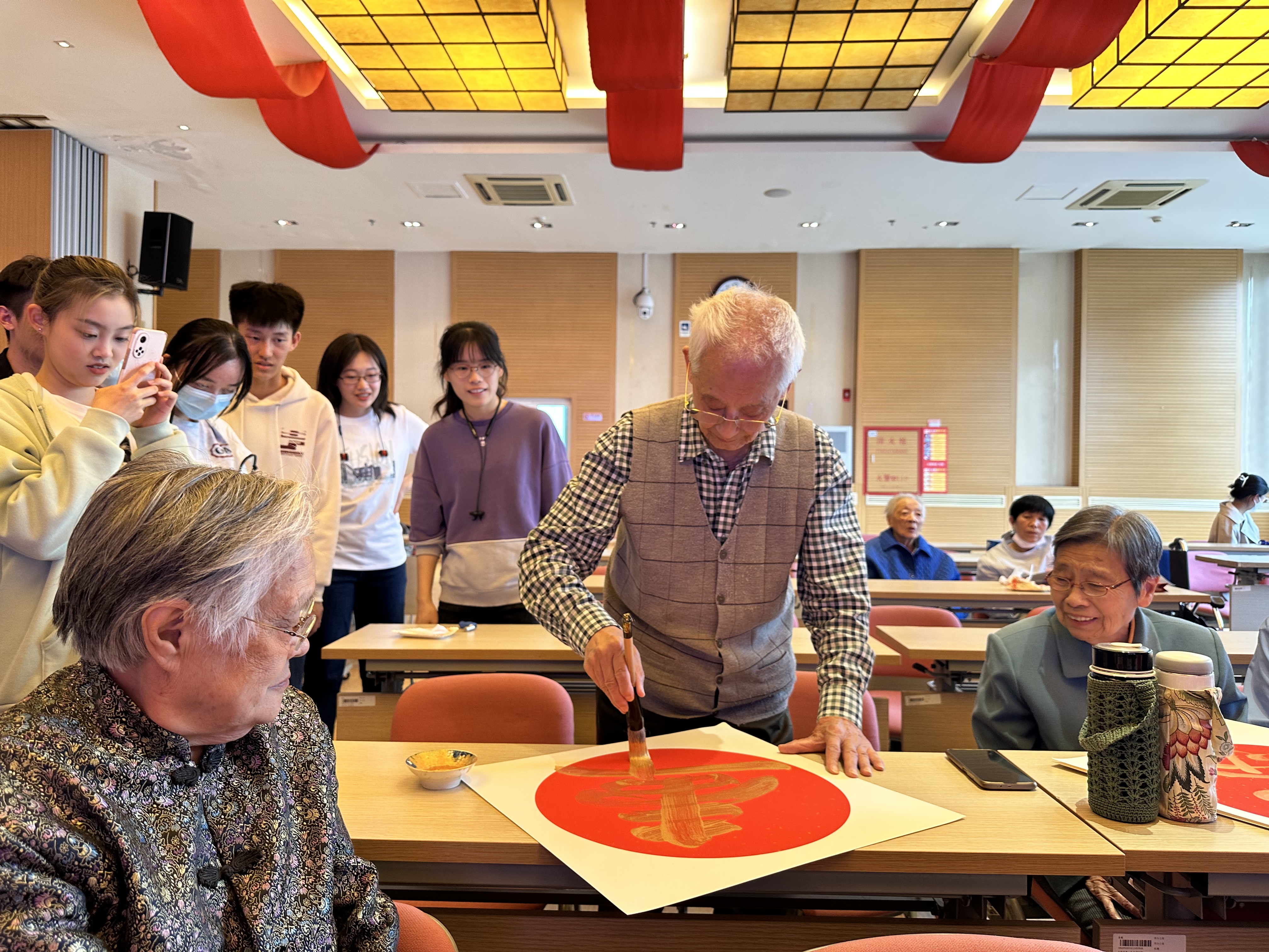 此外,在联欢会的中场,志愿者们还为老人们举办了集体生日会,一起唱响生日快乐歌,分享蛋糕。为送出特别的“生日礼物”,志愿者们不仅用各自所学的语言大声说出对老人们“身体健康”的祝愿,更用书法写下对老人们“福”“寿”“喜”“乐”的美好祝福。令人惊喜的是,一位擅长书法的爷爷也拿过毛笔,笔走龙蛇,写下对志愿者们“前程似锦”的祝愿,朴实无华的语言中兼纳着关心与期望。