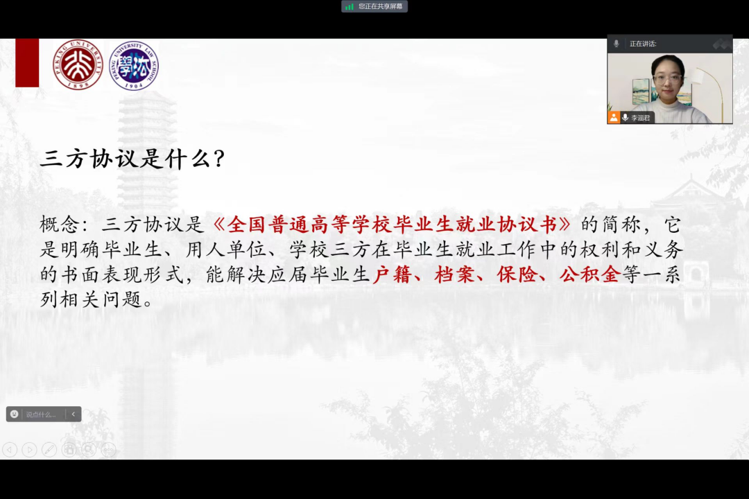 活动伊始,李淄君向同学们介绍了“三方协议”相关的法律知识,包括三方协议的定义、形式、内容,并讲解了三方协议如何发挥法律效力、签订协议前应当充分了解的各方面信息、如何与用人单位沟通三方协议、如何具体处理三方协议中各项约定等法律知识。她强调,在入职后应与用人单位及时签订劳动合同,签订三方协议前,要结合自身条件和岗位需求,做出审慎判断。