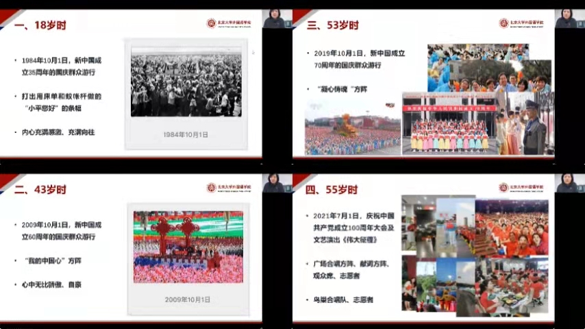 讲述三次参与国庆游行方阵的宝贵经历时,李淑静老师陷入了对青春岁月和光荣时刻的无限回忆。从“小平您好”到“我的中国心”再到“凝心铸魂”,过往数十载内发生在国家和校园的每一件往事通过珍贵的图片和老师的生动叙述呈现在学员们眼前,使大家仿佛坐上了时光机,与老师一同回到了那些激动人心的高光时刻,深刻领悟北京大学始终与国家和民族命运与共的丰富内涵。而在谈到今年的建党百年华诞庆祝活动时,李淑静老师说:“今年我虽然没有亲身参与到党的百年华诞庆典现场,但却时刻和参与到庆典活动的广大外院青年师生保持互动,迎接他们完成任务、光荣回家,共同见证这伟大时刻。在此过程中,我观察到身边越来越多的青年学子对党史有了更加清晰的认识,对中国精神有了更加深刻的理解。我由衷地感到欣慰,同时又很振奋,坚信新时代的你们一定能够勇担时代责任与历史使命,接好老一辈人的接力棒。”李淑静老师的一番话引发了外院青年人的共鸣。