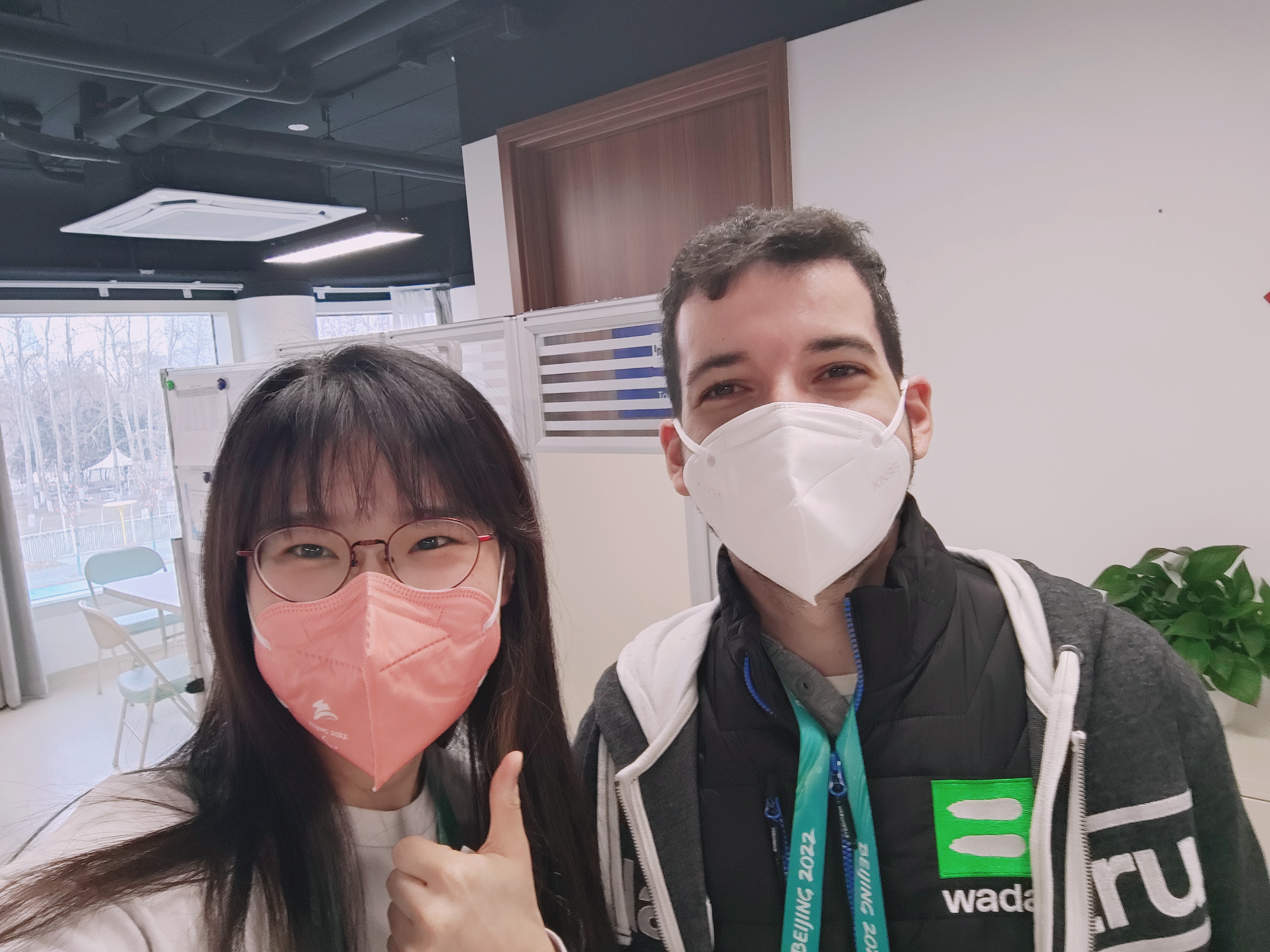 语言服务志愿者何璠和杜姝格同车,她们在冰立方的大家庭入口分开。何璠除了要负责翻译,还要在冰立方的奥林匹克大家庭休息室接待外宾。对于有些“社恐”的她而言,每天早上在门口向外宾打招呼是个小挑战。一开始的时候,她总是以无声的方式完成她的接待。“我会在帮外宾们刷电梯卡的时候点头致敬,但是我总觉得主动跟别人说早上好甚至聊天是一个难以完成的任务。”意外的是,在微笑着点头致敬后,她总能收到外宾热情的问好,这也鼓励了她走出舒适圈,尝试着说出了第一句热情得有些夸张的“早上好”,得到了她人生中第一个pin。“我觉得这是一个双向的促进,你很热情跟别人打招呼,别人也会很热情地跟你打招呼,这些祝福语既让他们开启了美好的一天,也让我自己的心情也变好了很多。”