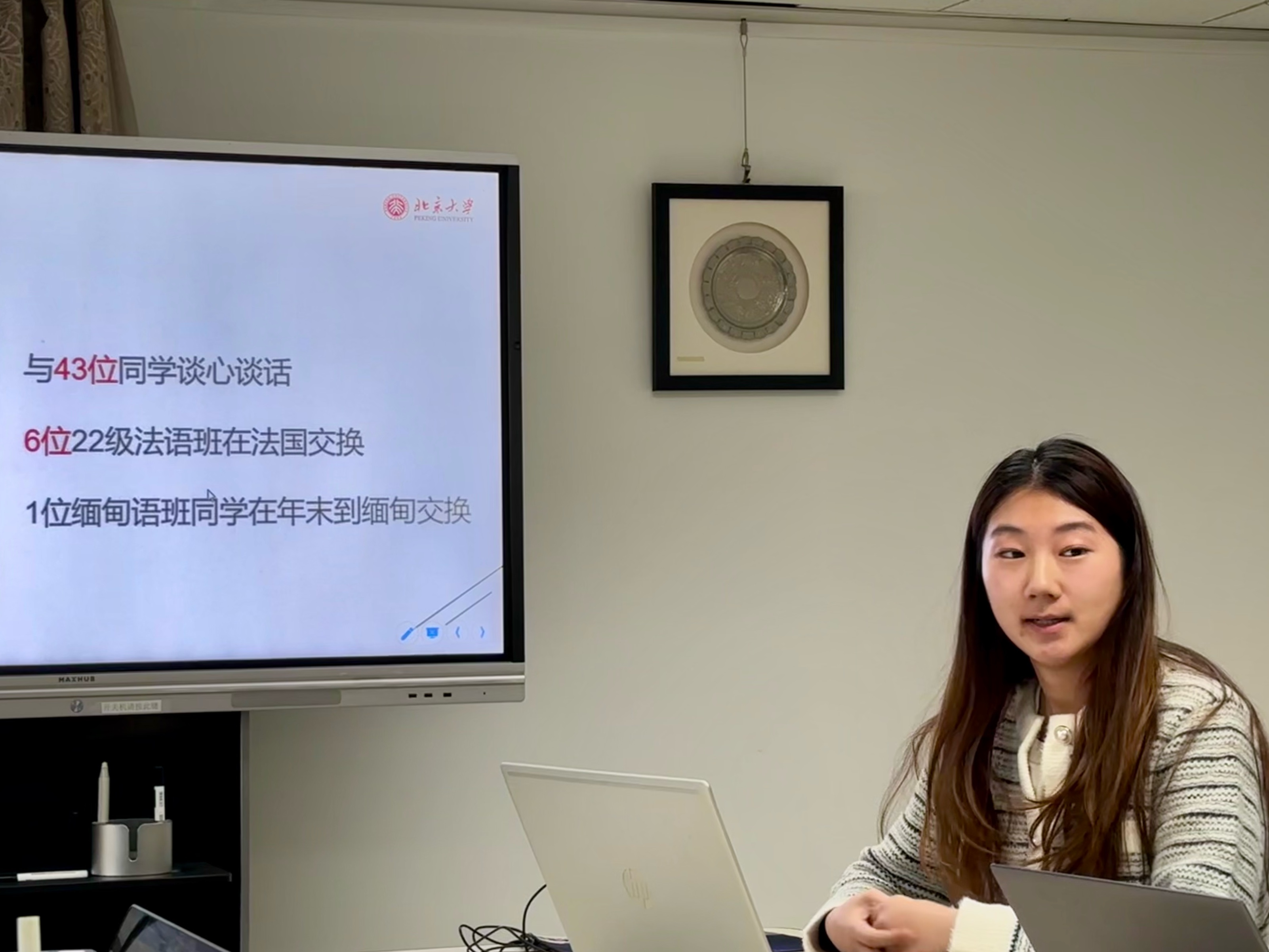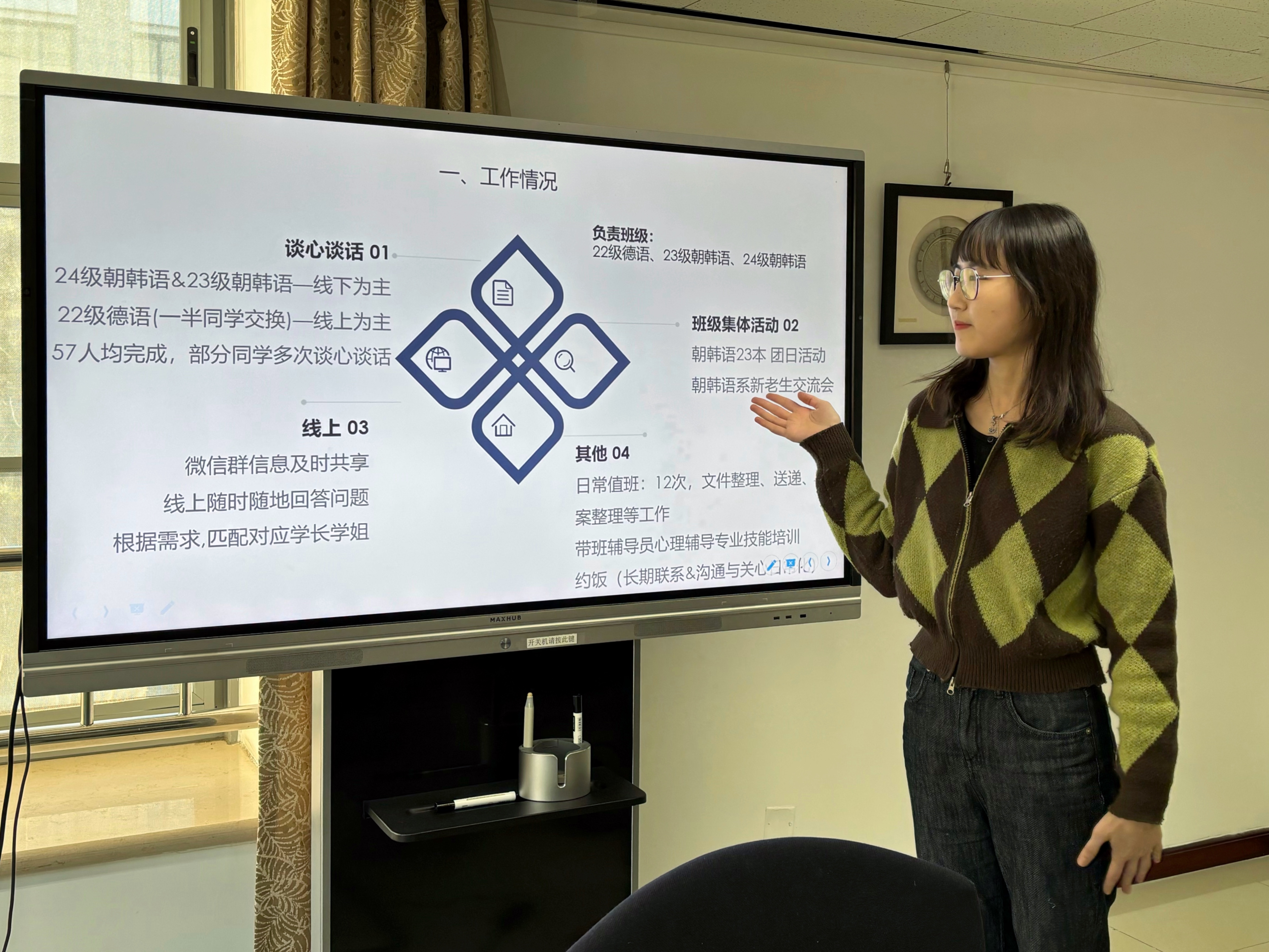 首先,带班辅导员依次进行述职。他们分别介绍了所带班级的基本情况,总结了本学期开展谈心谈话、参加班团活动、参与心理技能培训等工作内容,展示了个人的特色创新工作。同时,带班辅导员们也对寒假和春季学期的工作做出了规划与展望,包括优化工作思维,凸显思政引领价值;立足同学所需,持续做好深度辅导;注重示范引领,创新集体活动形式;加强朋辈交流,推动带班辅导员之间的互动学习等。