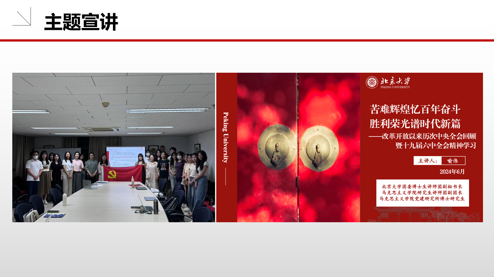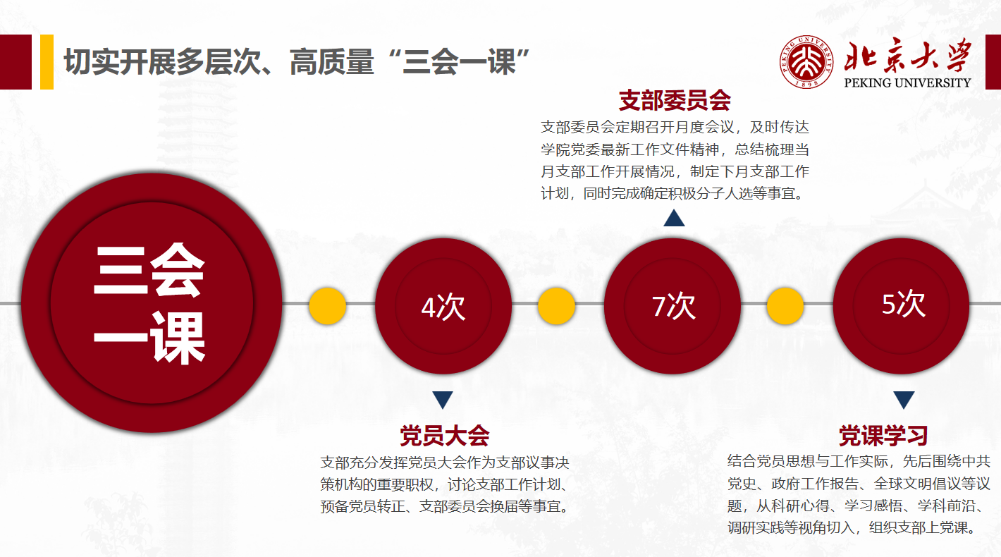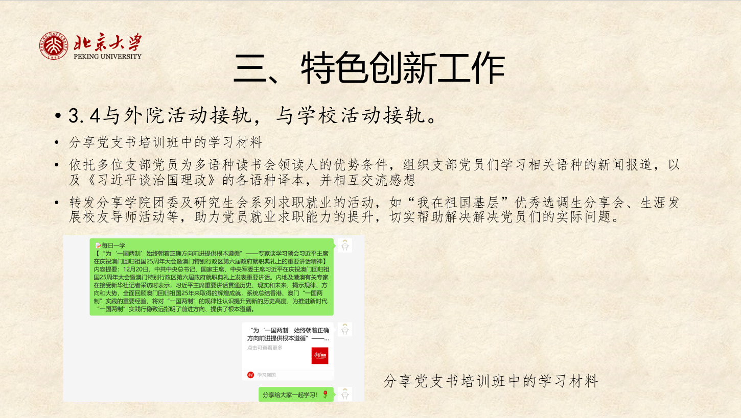 理论学习是提高党性修养的终生之需,是提高工作水平的重要途径,也是提高党员政治站位的重要方式。亚非研究生党支部邀请北京大学团委博士生讲师团举办理论宣讲学习活动,深入开展学习贯彻习近平新时代中国特色社会主义思想主题教育。本科生第七党支部打破传统理论学习的单向输出模式,围绕不同主题,持续深化红色“1+1”共建成果。德法西葡研究生党支部开设“每周一学”理论学习栏目,及时分享党的最新理论成果,引导党员同志关注国家大事,不断提升党性修养。朝韩语研究生党支部、英语翻译硕士生党支部和英语研究生党支部致力于建设有外语特色的学习型党支部,从理论学习到翻译实践,在增进专业技能的同时激发支部党员讲好中国故事的责任感与使命感。