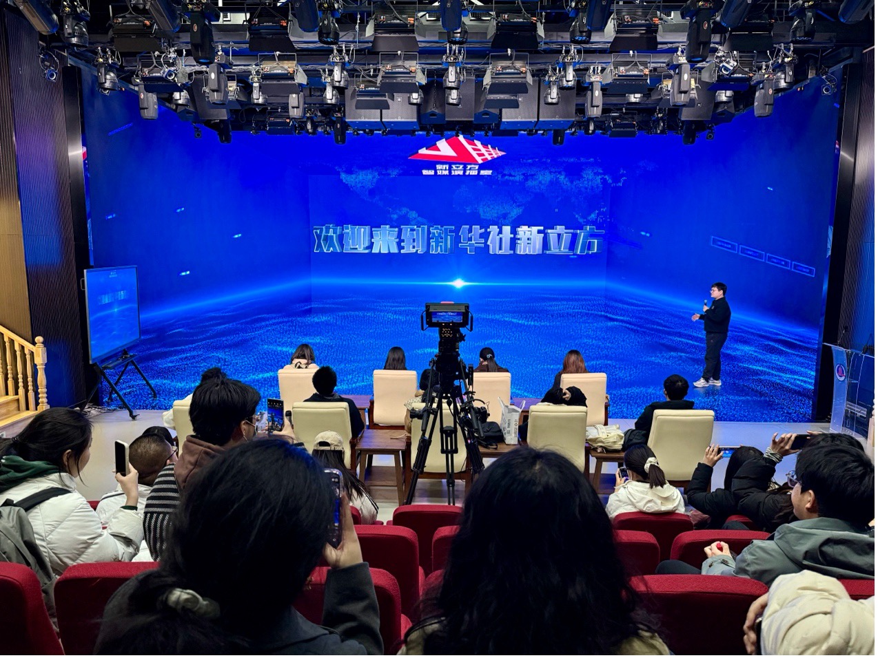 随后,外院师生参观了“新立方”媒体融合发展演播厅,体验新闻报道中的前沿技术应用。“新立方”媒体融合发展演播厅直观展现了三维建模技术、人工智能、大数据、5G、8K超高清等技术的应用,帮助同学们由点及面地了解媒介深度融合,领略数字新闻生产的潜能。