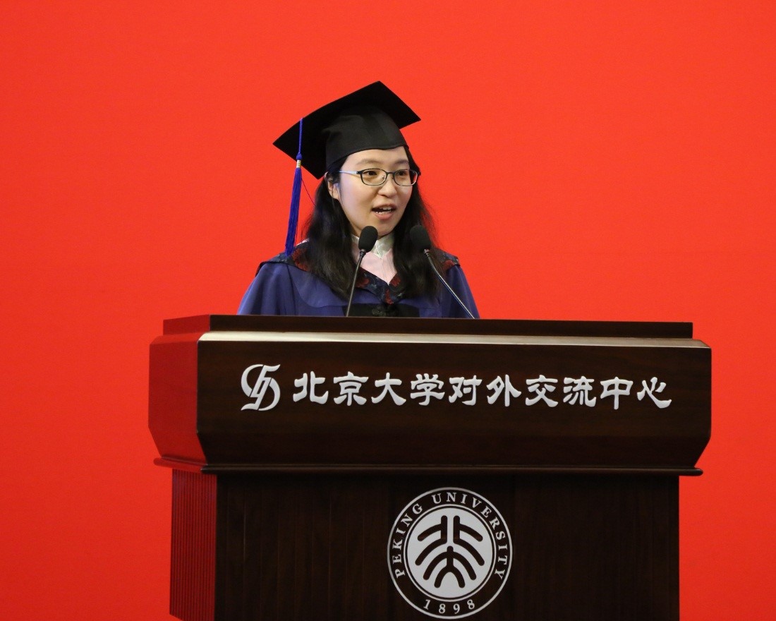 阿拉伯语系2015级硕士生满园则代表研究生毕业生发表了毕业感言。她情深地回忆了初入燕园的那份感动与好奇,其中既包含对燕园一草一木的眷恋不舍,从北大的湖光塔影、慵懒猫咪到外文楼前盛放的西府海棠;更浸透着对勤勉不怠的恩师、可爱可为的同窗的诚挚热爱。她在发言中表达,愿同学们都能心怀赤诚、坚守初心,在迈向未来之时不忘母校的恩泽和共同肩负的使命。