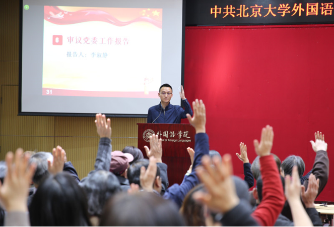 大会在庄严的国歌声中拉开帷幕。王恒同志主持会议。李淑静书记代表上一届党委作题为《凝心聚力促发展,立德树人育桃李》的工作报告。报告从“努力夯实党建工作基础”、“扎实开展专题学习教育”、“协同推进学院整体建设”等三方面总结了学院党委过去十年的工作。过去十年来,学院党员队伍整体素质优良,归口党委领导的党工群团工作都取得了显著成绩。学院党委努力把握好教学科研管理等重大事项中的政治原则、政治立场、政治方向,为学院的立德树人工作提供思想保证、精神动力、舆论支持和文化条件,协同推进学院的整体建设。报告同时指出,新的时期给学院党的工作提出了新的更高要求,在今后的工作中,我们要突出问题导向,以习近平新时代中国特色社会主义理论为指导,在北京大学党委的坚强领导下,多渠道加强思政工作,提高党建工作创造性,以改革精神推进党建,为促进学院和谐、推动科学发展尽职尽力,共启B体育平台新的征程。