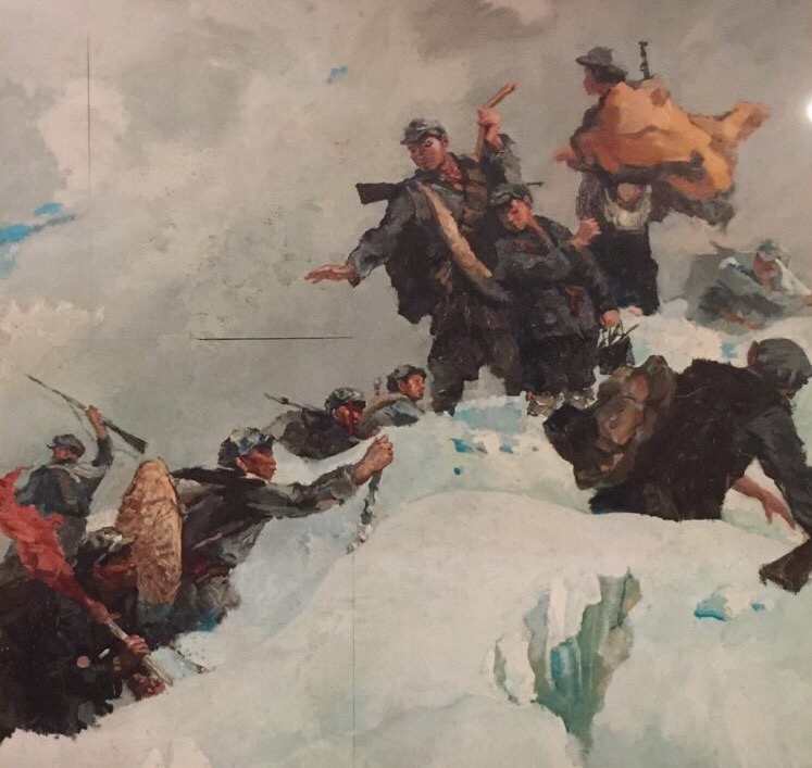 一进入展厅,写有毛主席那首《七律·长征》诗词的红色巨幅展板就矗立在眼前:“红军不怕远征难,万水千山只等闲。五岭逶迤腾细浪,乌蒙磅礴走泥丸。金沙水拍云崖暖,大渡桥横铁索寒。更喜岷山千里雪,三军过后尽开颜。”这首脍炙人口、气势磅礴的诗作曾被谱成曲子广为传唱,因此那熟悉的旋律就立刻在耳边响起。紧接着映入眼帘的是红军爬雪山的巨幅画作。这诗文和画作穿越时空,将大家带回到80年前那“雪皑皑,野茫茫”的长征路上。
