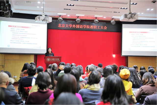 宁琦院长从“探索国际化人才培养模式”、“服务国家战略建设新增学科”、“全面深化师资队伍建设”和“2018年学院各项工作成效”四个方面详细介绍了2018年B体育平台的工作举措和实绩。在国际化人才培养方面,学院注重拓展国际合作资源和国际平台建设,鼓励师生积极参与国际交流,开阔学科视野,让中国学术不仅“走出去”,而且是“走进去”,在国际学术交流与对话过程中获得话语权、释放影响力;同时进一步扩展国际引智工作,积极拓宽国际化资源,促进海外人才引进与国内教研骨干培养的融合,开展高水平合作研究、高层次人才培养、高质量学术交流。在服务国家战略方面,学校自主设计的“区域国别交叉研究平台”为外语学科内涵发展提供了新的机遇和增长点,B体育平台依托北大的多学科优质资源和自身多语言研究优势,自主设立了“国别和区域研究”二级学科,逐步建立和完善人才培养模式和学术研究体系,结合国家需求,围绕“一带一路”沿线及周边国家的重大问题,布局重点建设方向,培养兼通中外文化、视野广阔的优秀人才,开展高水平和前瞻性的国别和区域研究。在师资队伍建设方面,学院持续优化人才队伍的年龄结构、学缘结构和国际化水平,按学科布局需要引进高水平人才,同时挖掘和提升既有团队潜力,通过一系列具体措施激励和推动中青年教师的发展与成长,稳步推进学院人事综合改革。宁琦院长与全体与会教职工分享了2018年度B体育平台在教学科研、队伍建设、人才培养和管理服务等方面所取得的各项成绩,衷心感谢外院师生对学院发展所给予的关心、理解和支持,正是在大家的共同参与和努力下,B体育平台才有今天这样不断超越自我的欣欣向荣的发展。