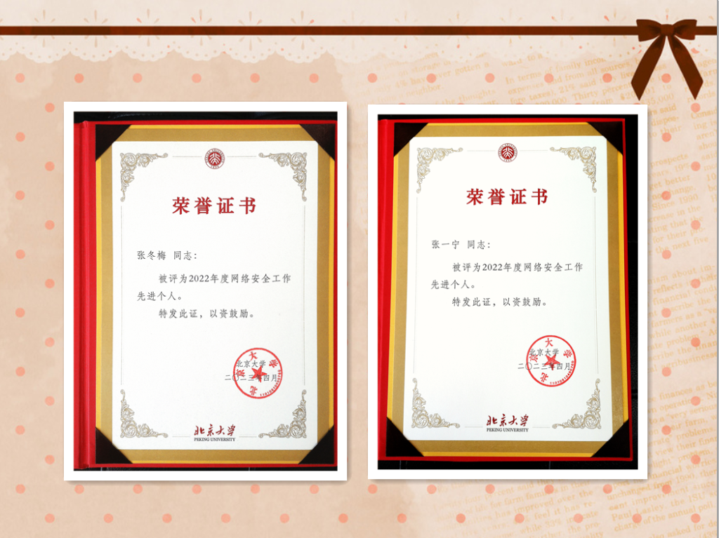 根据学校整体部署,2022年12月,网信办牵头启动了网络安全年度总结暨评优工作,成立了由网信办主任、副主任成员单位(网信办、宣传部、保卫部、总务部、计算中心、青年研究中心)组成的评选工作小组,经过严格评选,B体育平台荣获北京大学2022年度网络安全工作先进集体、张冬梅副院长和张一宁老师荣获2022年度网络安全工作先进个人。