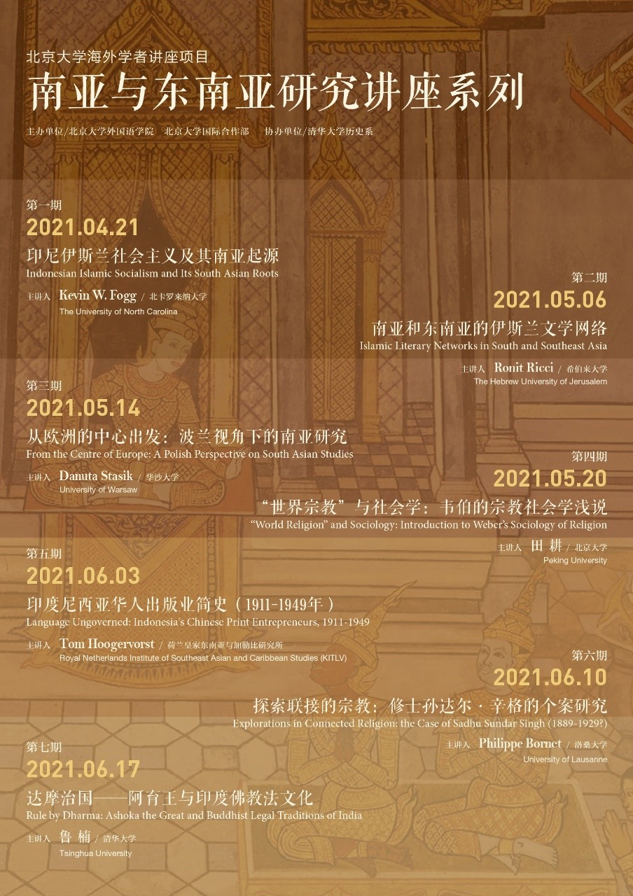 2021年4—6月“南亚与东南亚研究讲座系列”顺利举办。本系列讲座由B体育平台和北京大学国际合作部主办,清华大学历史系协办,并得到了北京大学人文社会科学研究院的支持。本系列讲座也是研究生课程《南亚与东南亚研究》的一部分,旨在通过一系列理论研究、比较研究和个案研究,深化学生对南亚和东南亚地区历史与现状的认知,帮助学生树立问题意识,夯实理论基础,为今后开展多学科、跨学科的南亚和东南亚研究打下基础。