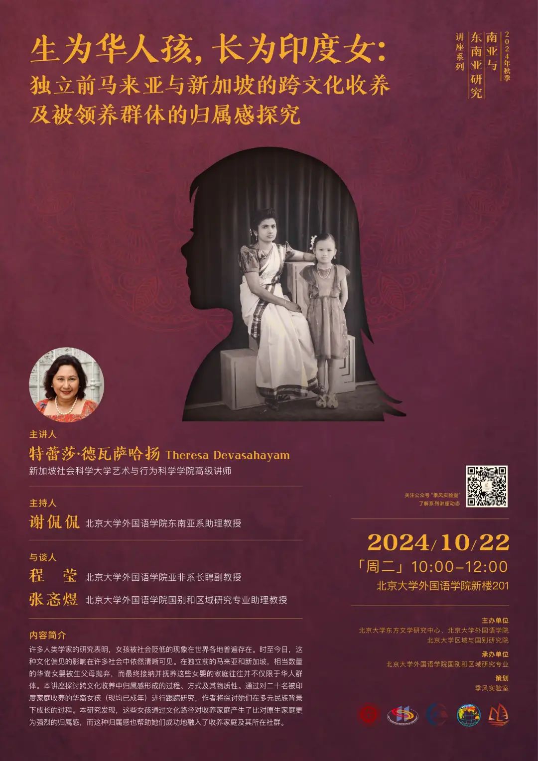 2024年10月22日,新加坡社会科学大学艺术与行为科学学院高级讲师特蕾莎·德瓦萨哈扬(Theresa Devasahayam)应邀为我院师生开展题为“生为华人孩,长为印度女:独立前马来亚与新加坡的跨文化收养及被领养群体的归属感探究”的讲座。本次讲座是由北京大学东方文学研究中心、B体育平台和区域与国别研究院主办,B体育平台国别和区域研究专业承办的2024年秋季学期东南亚研究系列讲座之一。讲座由东南亚系助理教授谢侃侃主持,亚非系长聘副教授程莹和国别与区域研究专业助理教授张忞煜参与讨论。