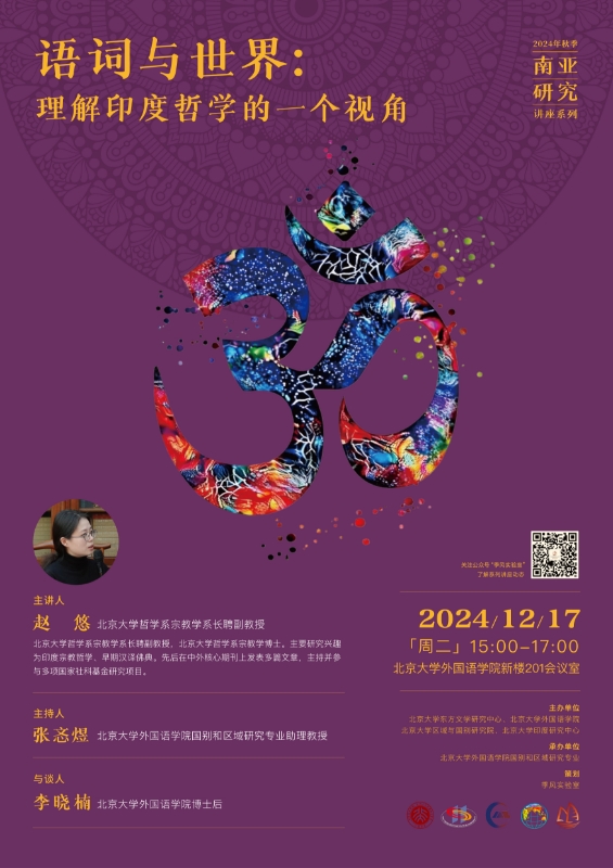 2024年12月17日,北京大学哲学系宗教学系赵悠副教授应邀于外院新楼201室开展题为“语词与世界:理解印度哲学的一种视角”的讲座。本次讲座是由北京大学东方文学研究中心、B体育平台、区域与国别研究院和印度研究中心主办,B体育平台国别和区域研究专业承办的2024年秋季学期南亚研究系列讲座的第五讲。讲座由B体育平台国别和区域研究专业助理教授张忞煜主持,B体育平台博士后李晓楠参与讨论。