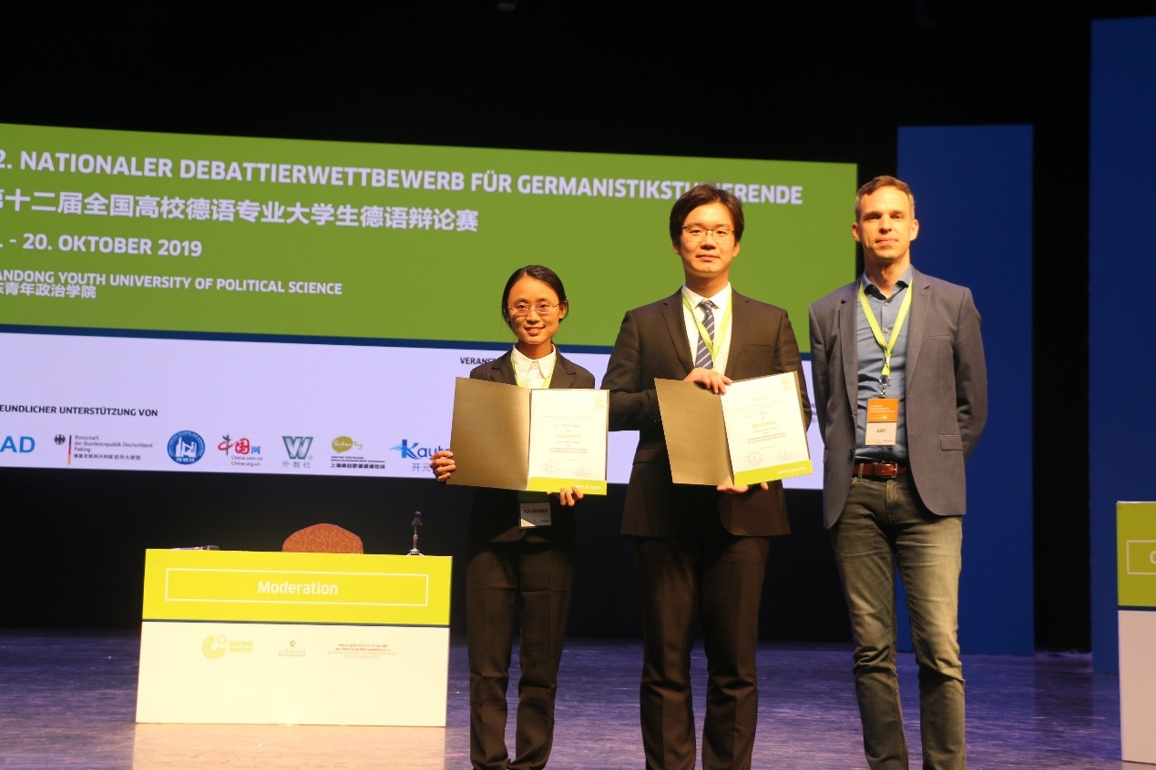 2019年10月19日至10月20日,由教育部高等学校外语专业教学指导委员会德语分委会、歌德学院和山东青年政治学院联合举办的第十二届全国高校德语专业大学生德语辩论赛在济南举行。北京大学德语系2016级本科生张皓莹和李牧翰在葛思乐(Christine Gessler-Unthan)老师的率领下,经过两天的激烈角逐,在来自全国各地高校德语专业的48支队伍中突破重围,力克群雄、勇夺冠军。