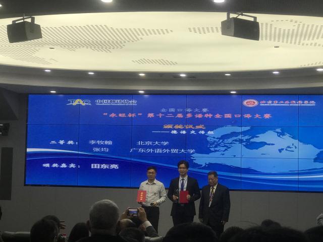 2019年10月26日,由中国翻译协会与北京第二B体育平台共同主办的“永旺杯”第十二届全国多语种口译大赛在北京第二B体育平台举行,我院德语系16级本科生李牧翰同学参加了德语组交替传译的比赛。李牧翰同学在比赛中思维清晰,表达流畅,以较高的质量完成了翻译任务,获得了评委专家的一致认可。以决赛总分第二名的优异成绩获得二等奖。