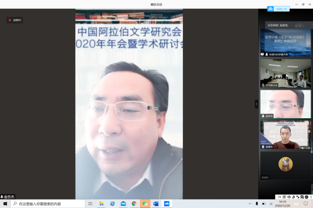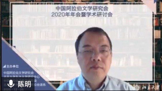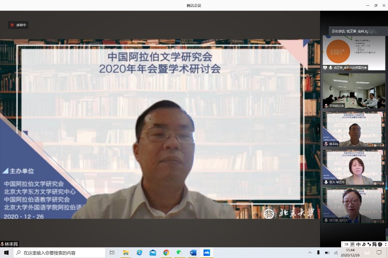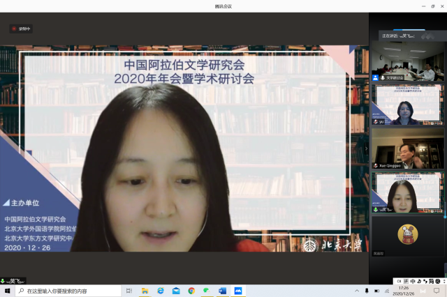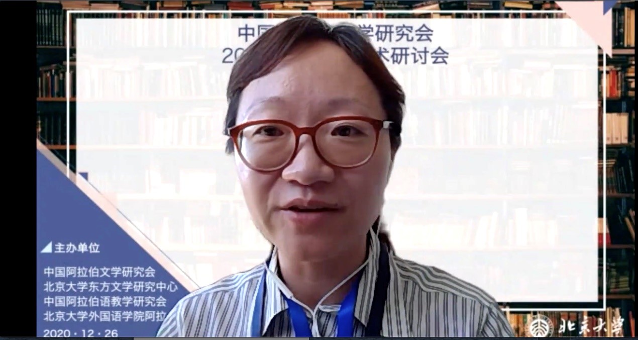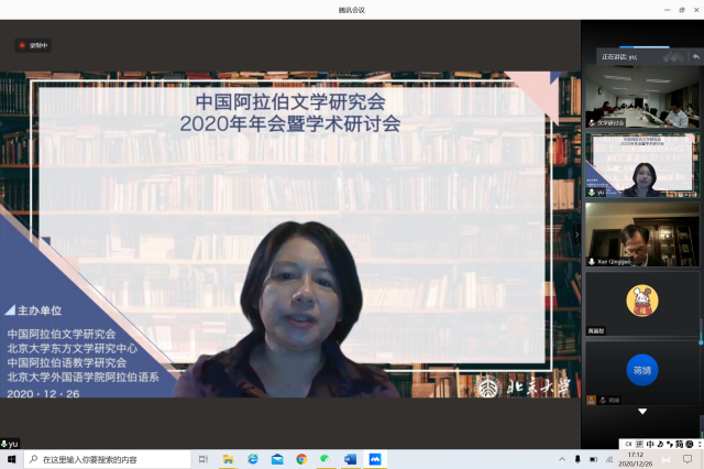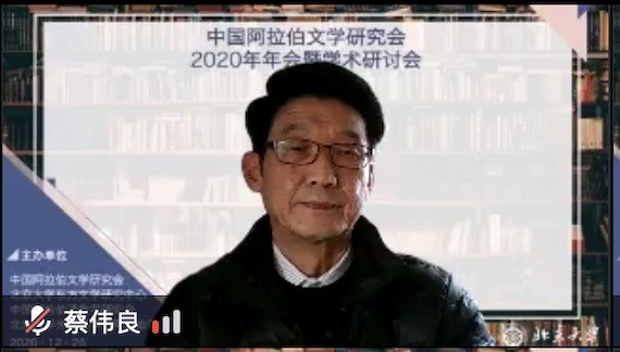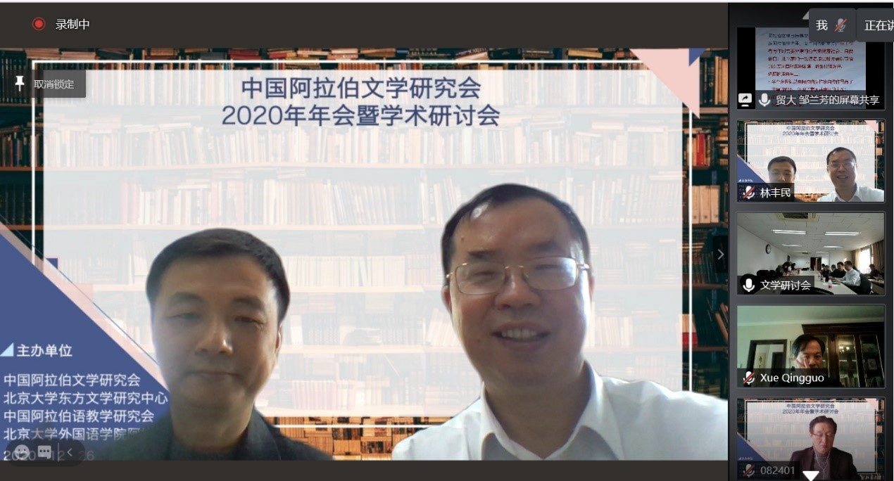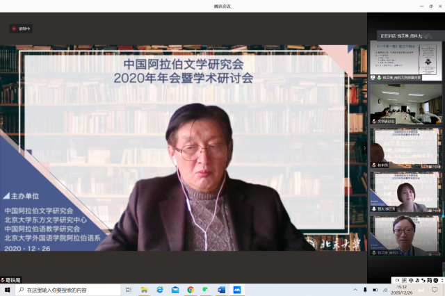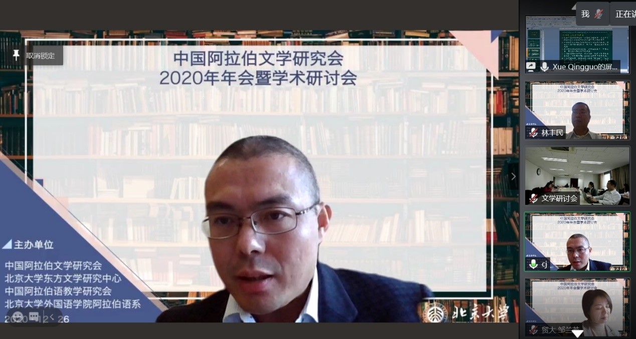 2020年12月26日,由中国外国文学学会阿拉伯文学研究分会、B体育平台阿拉伯语系和北京大学东方文学研究中心联合举办的“中国外国文学学会阿拉伯文学研究分会2020年会暨学术研讨会”以线上线下混合的方式召开。本次会议共有来自北京大学、中山大学、对外经济贸易大学、宁夏大学、北京外国语大学、上海外国语大学、北京语言大学、南方科技大学、西北民族大学、西北师范大学、索邦大学文学院(巴黎四大)、威廉•玛丽大学、埃及亚历山大大学、马来西亚苏丹阿都哈林姆阿占沙国际伊斯兰大学和中国社会科学院外国文学研究所等高校和研究机构的100多人参加。开幕式由研究分会副会长、北京外国语大学谢赫扎耶德研究中心主任薛庆国教授主持。