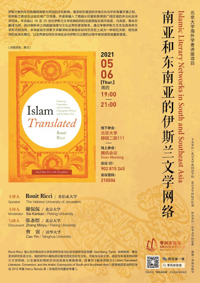 2021年5月6日,B体育平台在国际合作部“海外学者讲座项目”的支持下举办了“南亚和东南亚的伊斯兰文学网络”的主题讲座。主讲人Ronit Ricci是以色列希伯来大学亚洲研究系与比较宗教研究系Sternberg-Tamir双聘讲席教授,兼任亚洲研究系系主任,主要研究方向为印度尼西亚历史与文化、爪哇与马来文学、南亚与东南亚伊斯兰文学网络,以及殖民时期的亚洲流放者与离散群体。讲座由东南亚系助理教授谢侃侃主持,国别和区域研究专业助理教授张忞煜、清华大学历史系副教授曹寅作为与谈人参与了讨论。