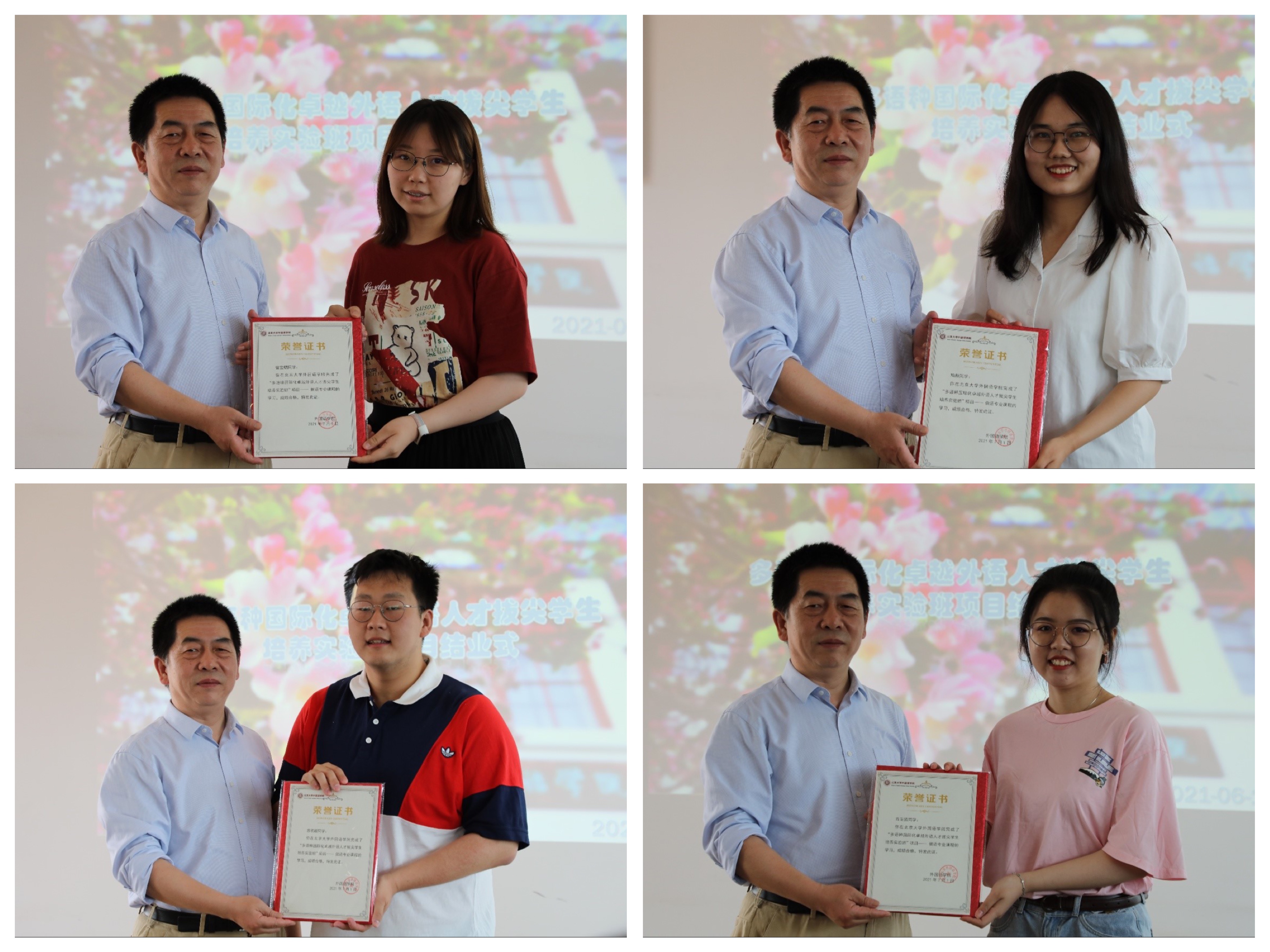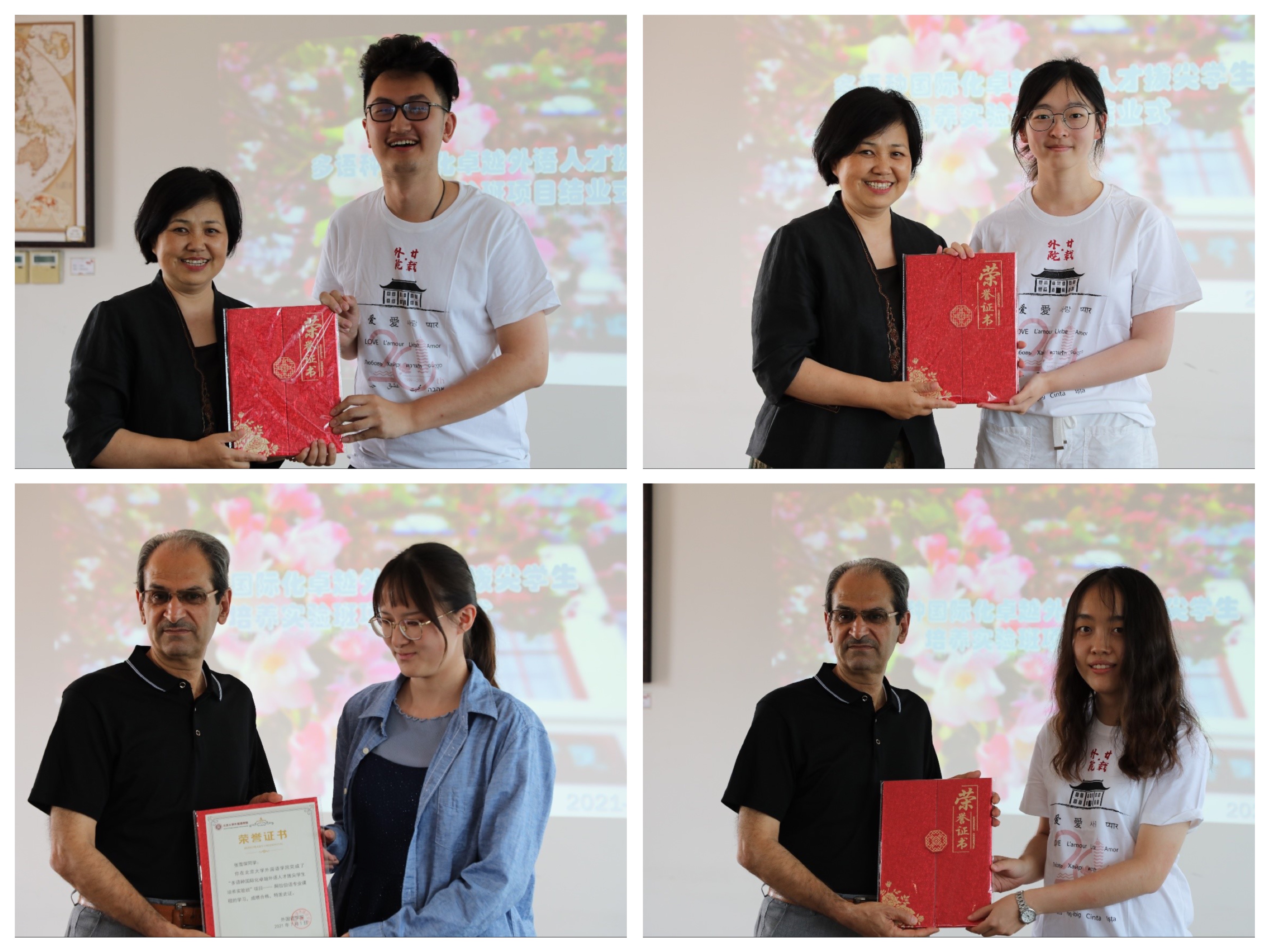 在颁发荣誉证书环节,阿拉伯语专家Hamoud Younes、刘建波副部长、李淑静书记分别为阿拉伯语班(秋昱翀、张雪琛同学)、俄语班(苏祺超、隋新、曾宝熠、肖至俏同学)、西班牙语班(薛尔清、王欣萌同学)颁发了证书。