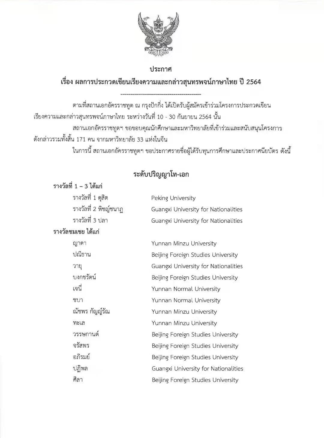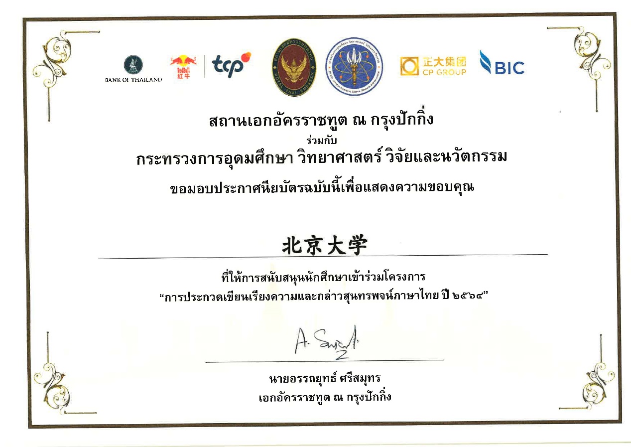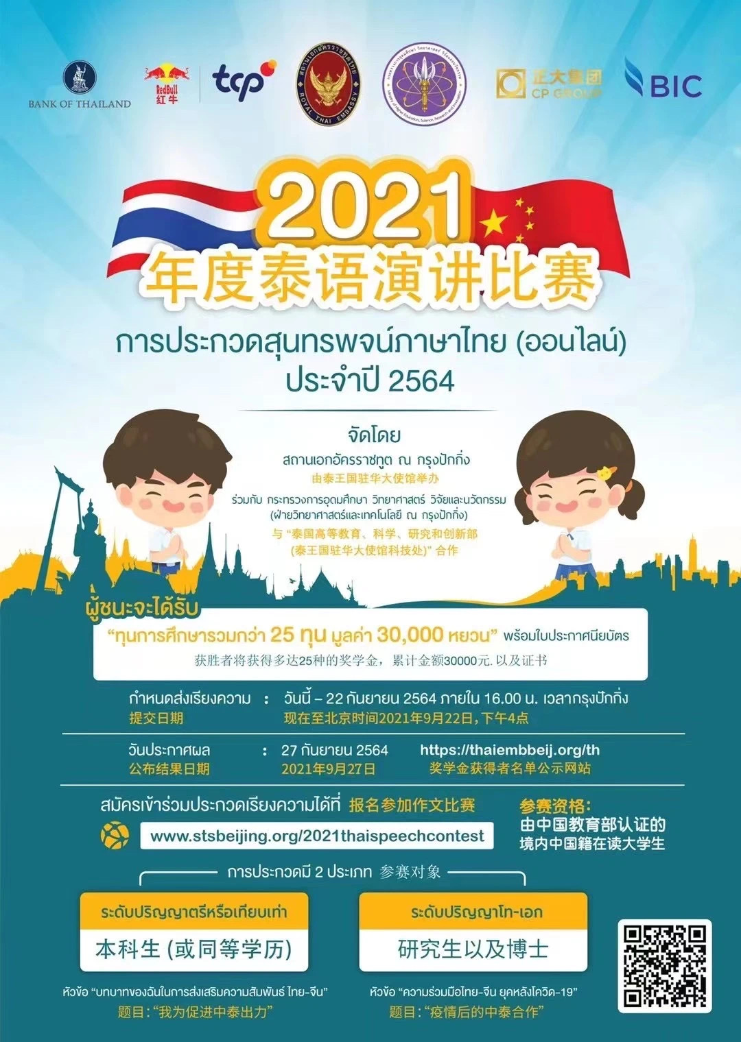 2021年9月10日至30日,“2021年度全国泰语演讲比赛”在线上举行,B体育平台东南亚系2018级泰语专业硕士生陈洪锋在众多参赛选手中脱颖而出,荣获硕-博组第一名。此次演讲比赛由泰国驻中国大使馆主办,旨在促进中泰之间的教育、语言和文化交流,获得了泰国高等教育科研与创新部(Ministry of Higher Education, Science, Research and Innovation)、泰国中央银行(Bank of Thailand)、天丝集团(TCP Group)、红牛饮料有限公司(Red Bull Beverage Co.,Ltd.)、正大集团(CP Group)等多所机构的支持。此次演讲比赛是泰国驻中国大使馆举办的第二届全国性泰语演讲比赛,分为“写作”和“演讲”两个部分。虽然受疫情影响,此次演讲比赛以线上形式举办,但参与院校数和参赛人数均远超以往。据统计,主办方共收到来自全国33所高校泰语专业本硕博学生的踊跃投稿,参加人数达171人。