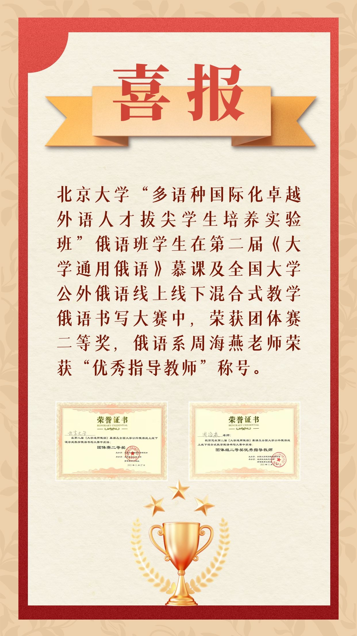 喜报:卓越俄语班学生在全国俄语书写大赛中喜获佳绩