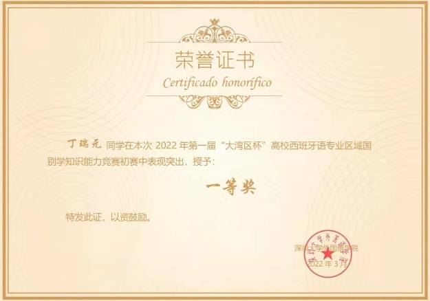 日前,北京大学西班牙语专业20级本科生丁瑞元、19级本科生刘雨婷参加了“2022年‘大湾区杯’高校西班牙语专业区域国别学知识能力竞赛”,分获一、二等奖。