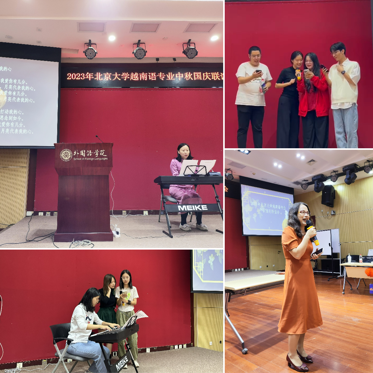 活动正式开始后,师生们用精彩的歌舞表演将全场氛围一次又一次推向高潮。歌曲《七里香》唤起了同学们对盛夏的美好回忆,夏露老师一首《你是人间的四月天》表达了对新生同学们热忱的希冀。《月亮代表我的心》《借月》等节目更是聚焦“月”这一中秋文化意象。“月”中有无尽的思念,她是每个游子咏怀的对象,虽说“月是故乡明”,但“明月何曾是两乡”。此时此刻,来自五湖四海的越语学生虽远离家乡,却并不孤单,与古人穿越千年时光,与家人横跨千山万水,共赏一轮明月,感受流淌在血脉中的悠久文化。两位来自北大中文系的越南留学生也与大家一同演唱中越歌曲,同学们通过歌声表达两国青年对中越两国文化的了解和喜爱。