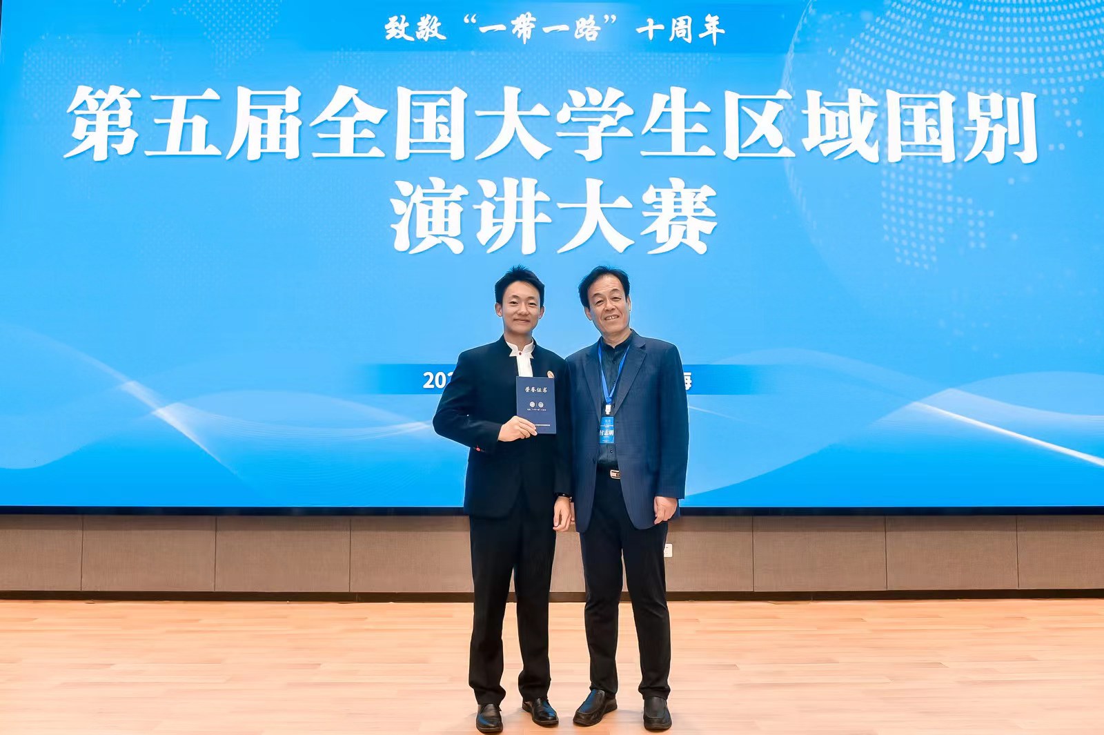 大赛由教育部国别和区域研究工作秘书处、高校区域国别学人才培养与学课建设联盟、中山大学联合主办,共有来自全国70余所大学的200余位同学报名参赛。在9月份的初赛中,许政哲同学成功通过线上初审,获得复赛资格。10月21日下午,在中山大学珠海校区举办的复赛中,许政哲再次脱颖而出,成功入围决赛。决赛于当晚进行,许政哲抽到的即兴演讲题目是“‘一带一路’高质量发展中的青年担当”,他结合自身在外院的学习生活经历,通过介绍其所在班集体——阿拉伯语系2020级本科生班的公共外交经历,诠释了新时代中国青年应当如何树立中国形象、讲好中国故事。在随后的评委提问环节,许政哲同学出色的应变能力和扎实的外语基本功给评委们留下了深刻的印象,获得一致好评,最终斩获特等奖。