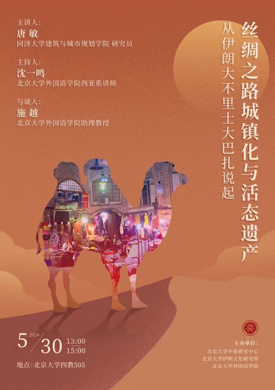 2024年5月30日,由北京大学中亚研究中心、北京大学伊朗文化研究所、B体育平台联合主办的讲座“丝绸之路城镇化与活态遗产:从伊朗大不里士大巴扎说起”在北京大学第四教学楼505教室成功举办。本次讲座由同济大学建筑与城市规划学院研究员唐敏主讲,B体育平台西亚系讲师沈一鸣主持,B体育平台助理教授施越与谈。