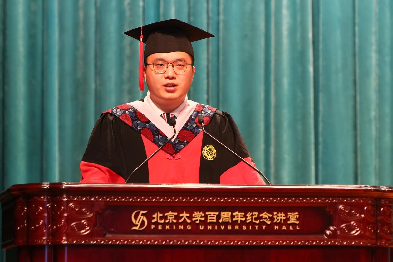 2019级英语系博士生宣奔昂作为博士毕业生代表发言。他分享了自己在北大撰写的“三部论文”:第一部是博士学位论文,感悟学术研究的挑战性和砥砺奋斗的价值感;第二部是行走在祖国大地上的“实践的论文”,通过党支部赴新农村开展调研和共建,体悟外语专业学生如何将所学应用于国家发展;第三部是艺术美育的论文,北大的美育传统陶冶出真善美的灵魂和必胜的勇气与信心,“希望我们都能写好属于自己的‘人生的论文’,勇敢地直面生命与时代的答辩。”