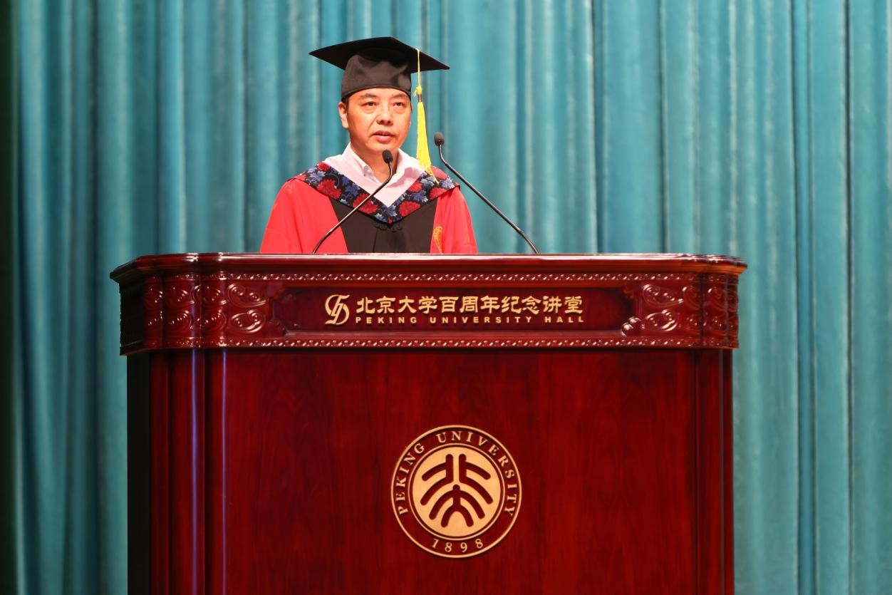 在热烈的掌声中,院长陈明为毕业生深情寄语。他引用李白诗句“却顾所来径,苍苍横翠微”,回顾同学们在燕园的青春岁月和成长历程。执手相别时,他提醒毕业生们,功崇惟志,业广惟勤,唯有胸怀家国,心系人民,勤学慎思,方能守正笃实,久久为功。同时,他鼓励同学们不忘初心,走进基层,融入群众,博观约取,厚积薄发,在知行合一之中,读好无字之书,成就精彩人生。最后,陈院长向毕业生送上最真挚的祝福,无论未来道路如何,未名博雅永远是同学们的精神家园,真诚守候着同学们的归来。