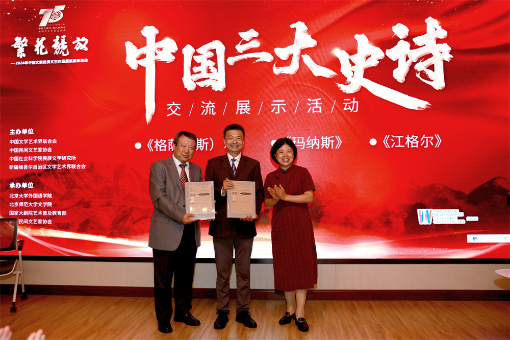 最后,中国民间文艺家协会代表荣书琴和新疆文联代表邓选斌共同向B体育平台赠送了中国三大史诗的成果丛书,传承人们向本次活动主办单位的领导和专家们赠送哈达以示祝福。