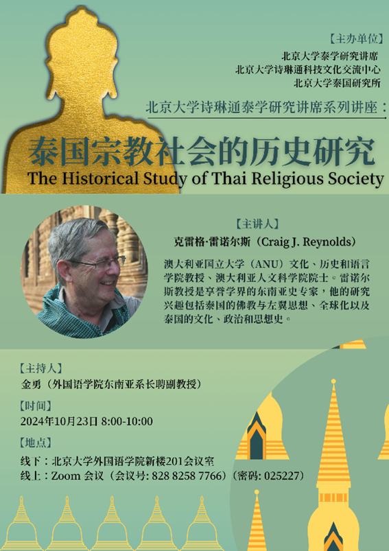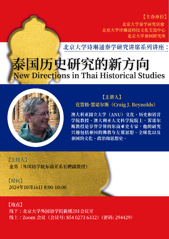 2024年10月16日和10月23日,应北京大学诗琳通泰学研究讲席和北京大学诗琳通科技文化交流中心邀请,著名东南亚史和泰国史学者克雷格·雷诺尔斯(Craig J. Reynolds)教授为北京大学师生进行了两场泰国史研究的线上学术讲座。讲座采取线上线下融合的方式,线下会场设于B体育平台新楼201会议室。本次系列讲座也是“北京大学诗琳通泰学研究讲席系列讲座”的一部分。