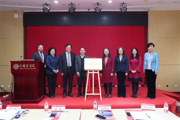 蒋璐、陈明、樊星和意大利研究学界资深专家王军为欧语系揭牌,李淑静、刘全、林温霜和欧语系副系主任成沫共同上台见证。